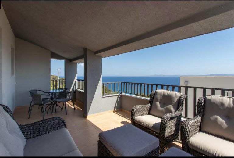 • Prostorný obývací pokoj s přístupem na terasu, ze které se naskýtá úžasný výhled na moře.
