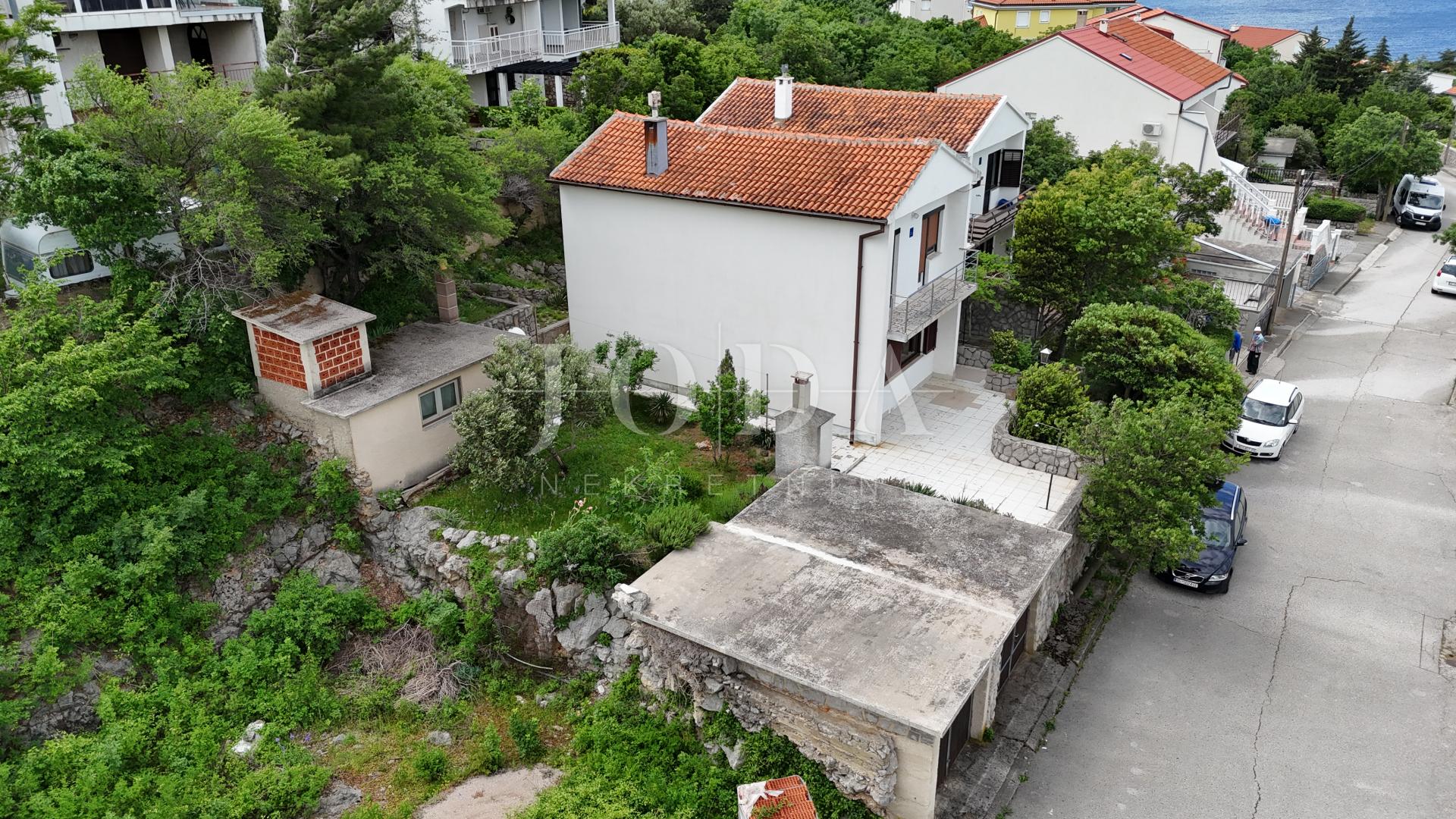 V Klenovici, v klidné a atraktivní lokalitě, se prodává samostatně stojící dům se dvěma garážemi a prostornou zahradou. Přízemí se skládá z chodby, kuchyně s jídelnou a vstupem na komorní terasu, koupelny, obývacího pokoje a jedné ložnice. Vnitřní schodiště vede do prvního patra, kde se nacházejí dvě prostorné a jedna menší ložnice, další koupelna a velká terasa s krásným výhledem na moře. Ve dvoře se nachází další místnost, která slouží jako sklad, a také krásně upravená zahrada. Dvě garáže poskytují dostatek prostoru pro parkování a skladování. Nemovitost je ideální pro rodinný život, ale také jako investice pro turistický pronájem.