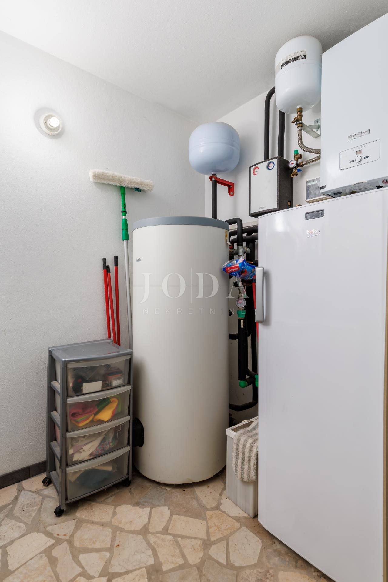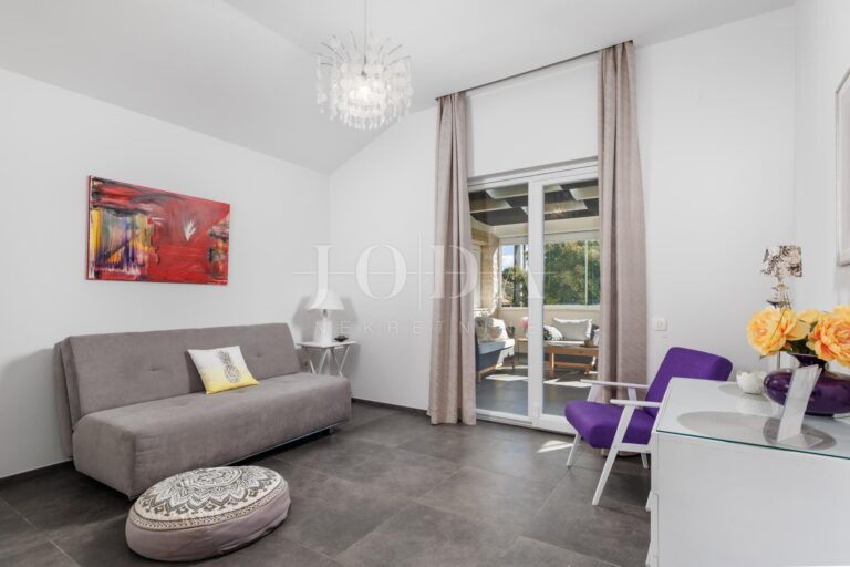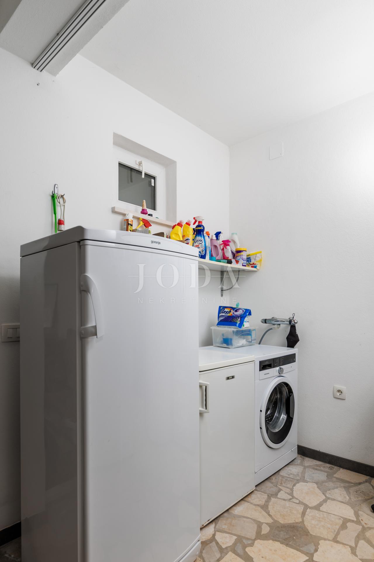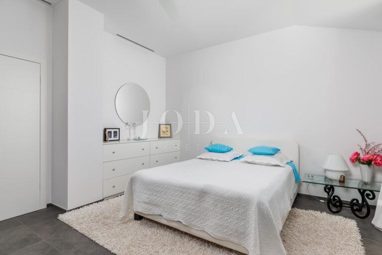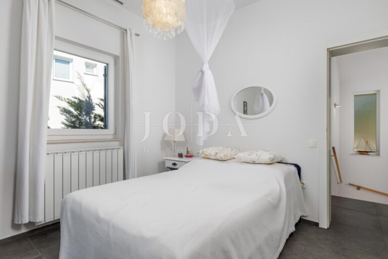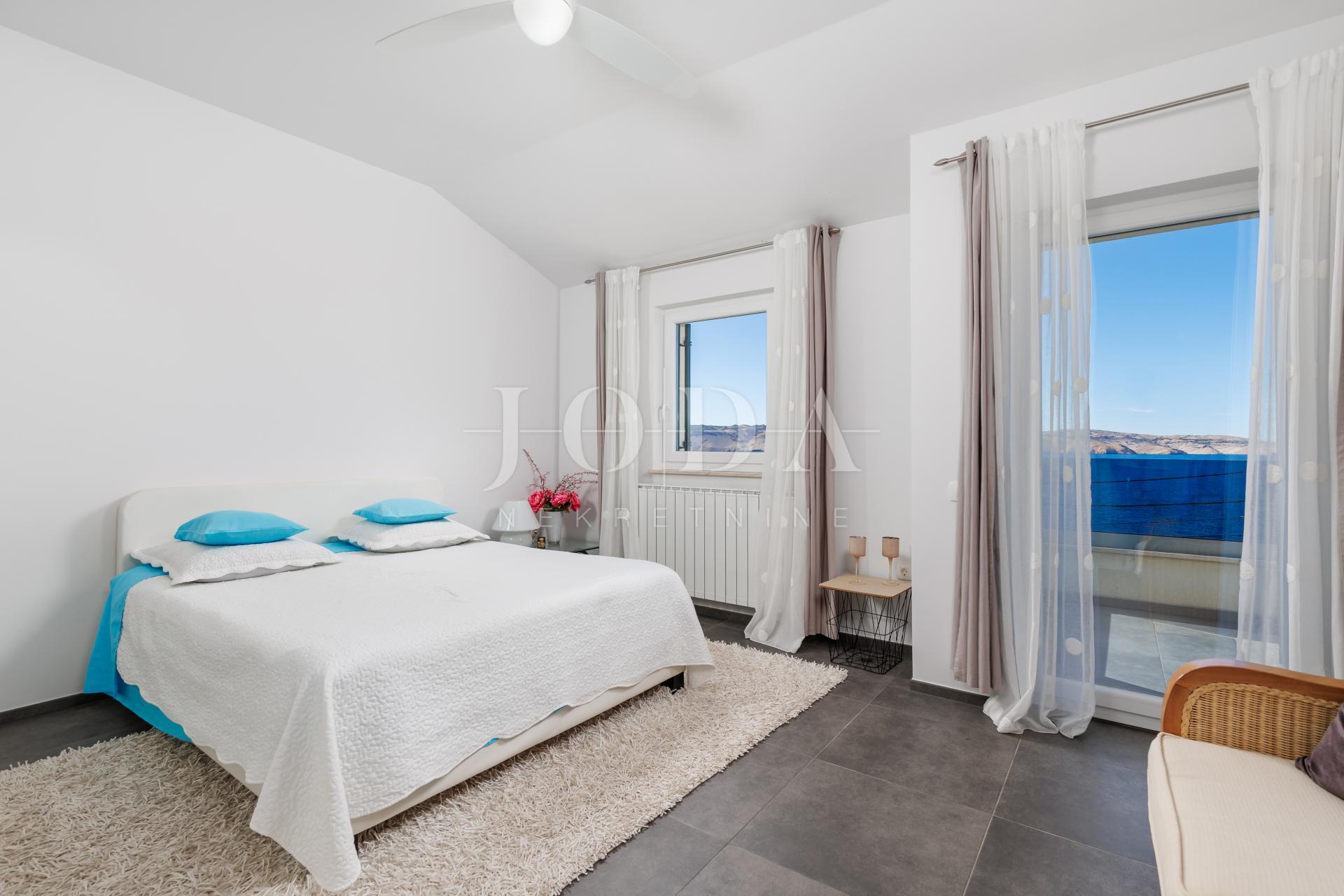 V prvním patře jsou situovány tři prostorné ložnice a další koupelna. Nechybí ani zimní zahrada, která nabízí nádherný výhled na moře a ostrov Pag, slibující nezapomenutelné ranní probuzení a večerní relaxaci.