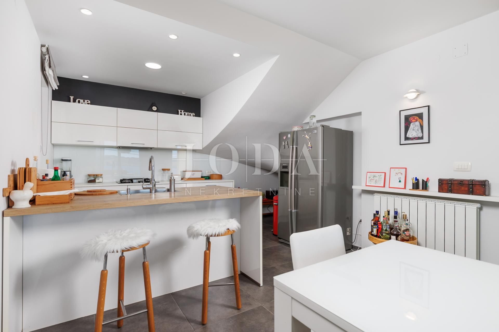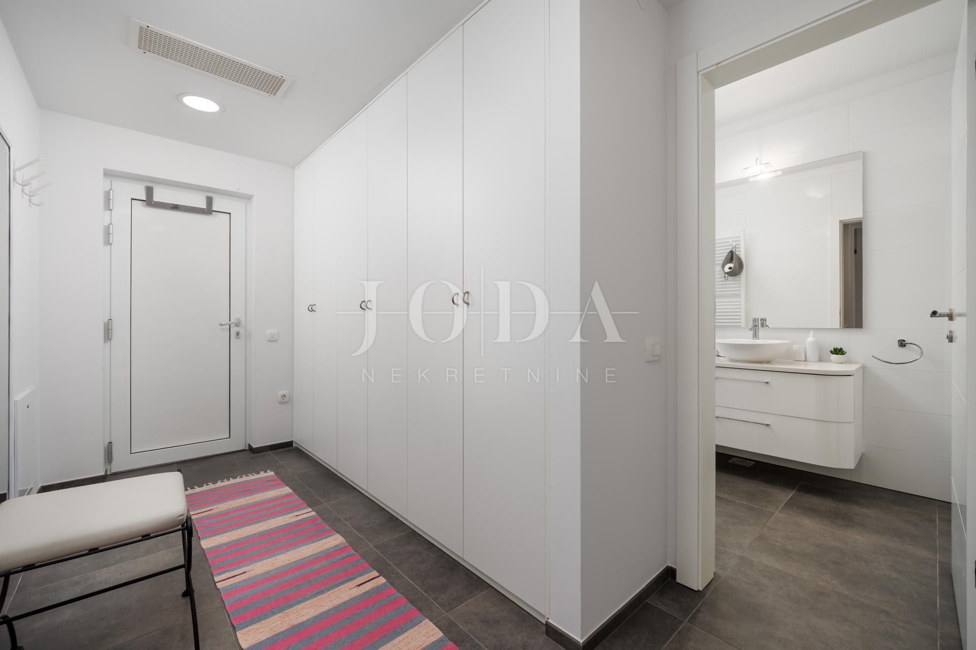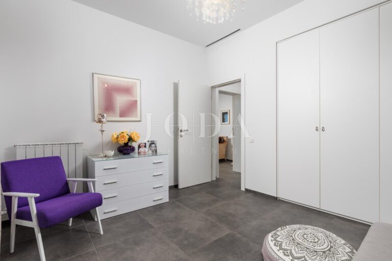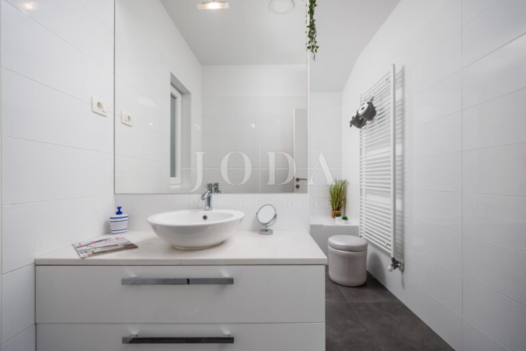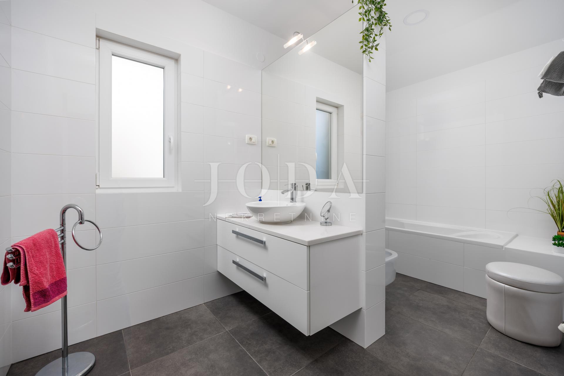 V prvním patře jsou situovány tři prostorné ložnice a další koupelna. Nechybí ani zimní zahrada, která nabízí nádherný výhled na moře a ostrov Pag, slibující nezapomenutelné ranní probuzení a večerní relaxaci.