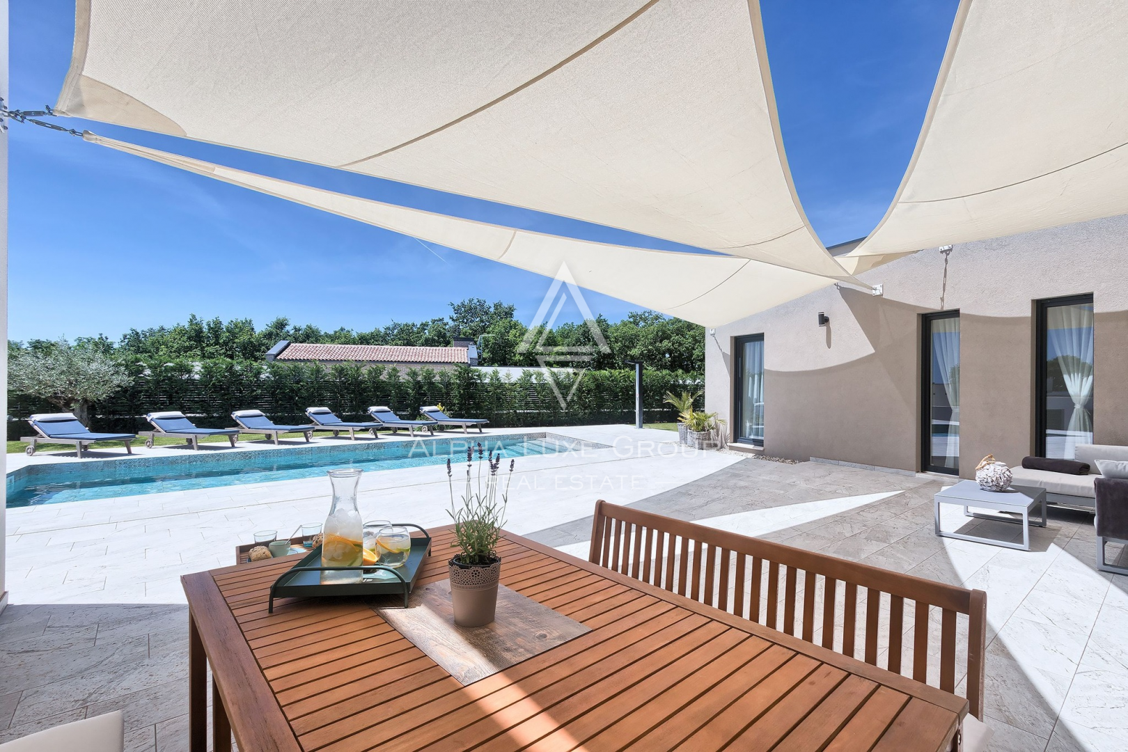 Jednopodlažní dispozice zahrnuje 148 m², z toho 123 m² obytné plochy a 25 m² plně vybavené letní kuchyně. Interiér nabízí světlý a vzdušný otevřený prostor spojující moderní kuchyň, jídelnu a obývací pokoj. Velké skleněné plochy zajišťují dostatek denního světla a plynulý přechod na terasu a do udržované zahrady.
