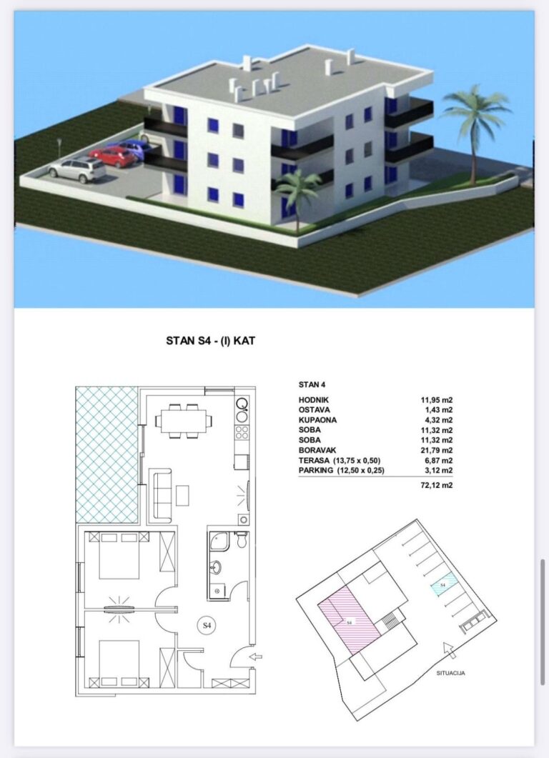 Byt se nachází v prvním patře moderního bytového domu postaveného v letech. Celková plocha je 72,12 m² a k dispozici je také balkon o rozloze 6,87 m², který nabízí výhled na moře, ideální pro pití ranní kávy nebo večerní relaxaci. Orientace bytu je jihozápadní, což umožňuje dostatek denního světla a příjemnou atmosféru po celý den. Výhled na moře z balkonu dále zvyšuje hodnotu a atraktivitu nemovitosti.