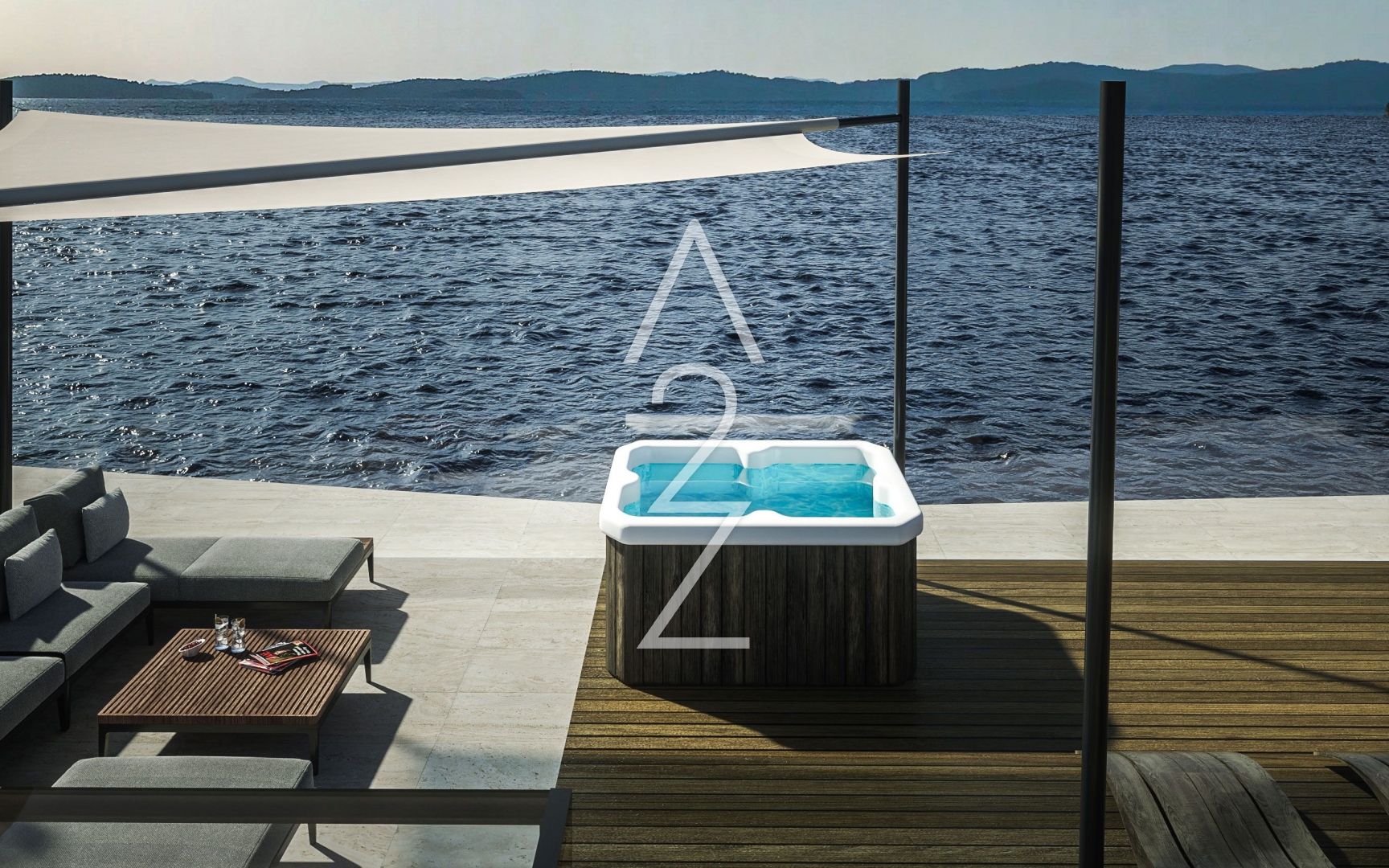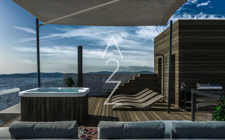 Zde naleznete saunu, prostornou terasu s bazénem o rozloze 22 m2 s panoramatickým výhledem na město a ostrovy, a toaletu.