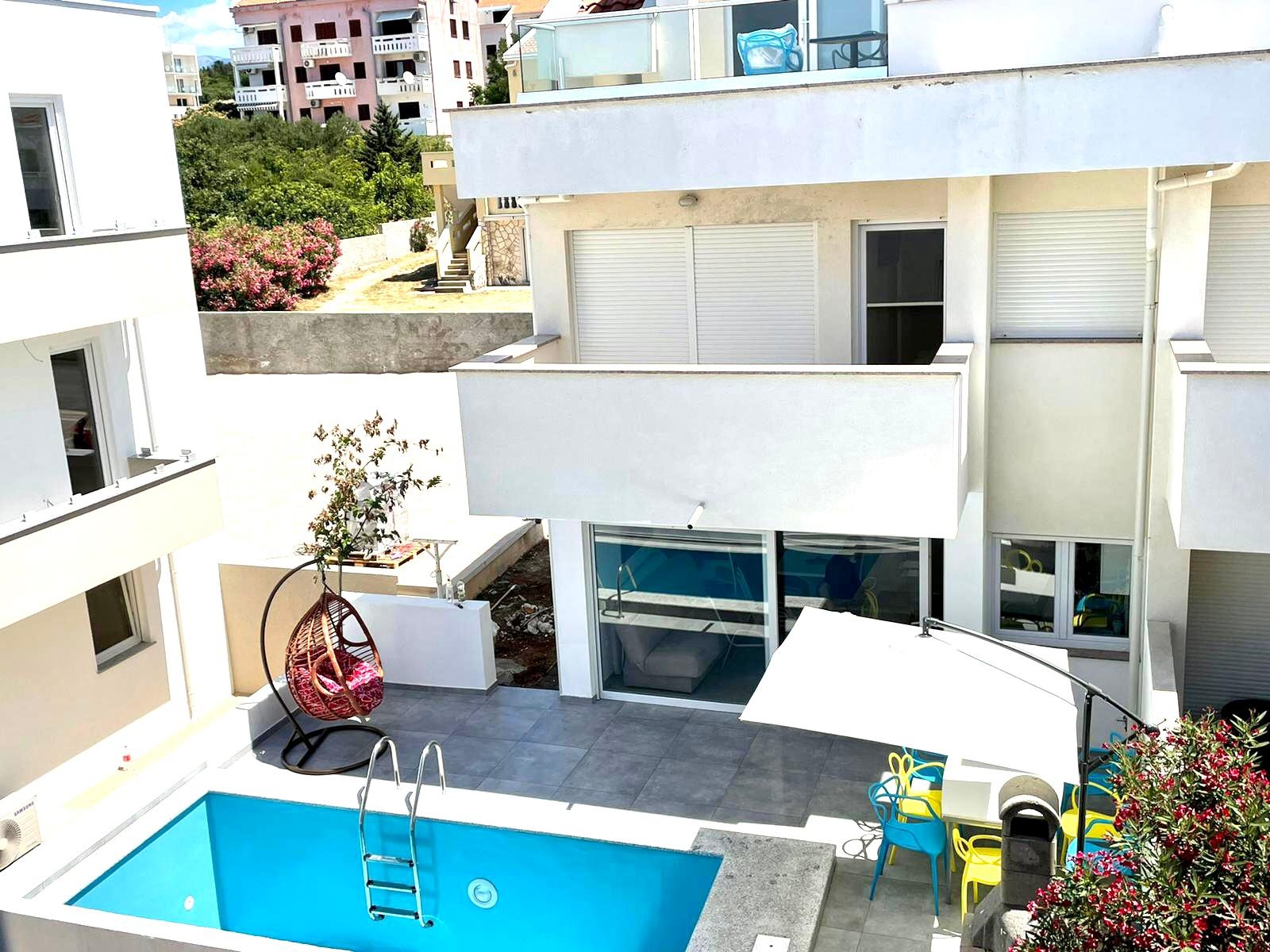 BYT E1 – NOVALJA – PŘÍZEMÍ SE ZAHRADOU, PRVNÍ A DRUHÉ PATRO SE SOUKROMÝM BAZÉNEM A VÝHLEDEM NA MOŘE – VÝHODNÁ INVESTICE