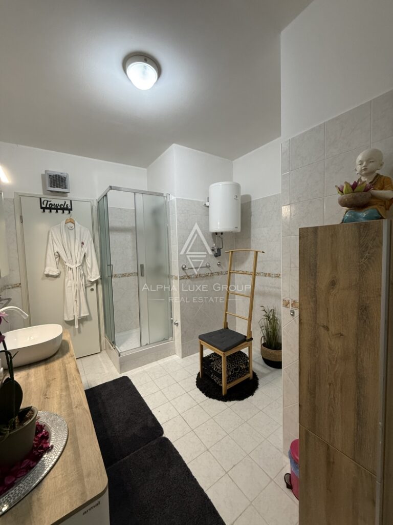 • Horní podlaží: Dvě pohodlné ložnice, chodba, koupelna a další terasa s panoramatickým výhledem na moře.