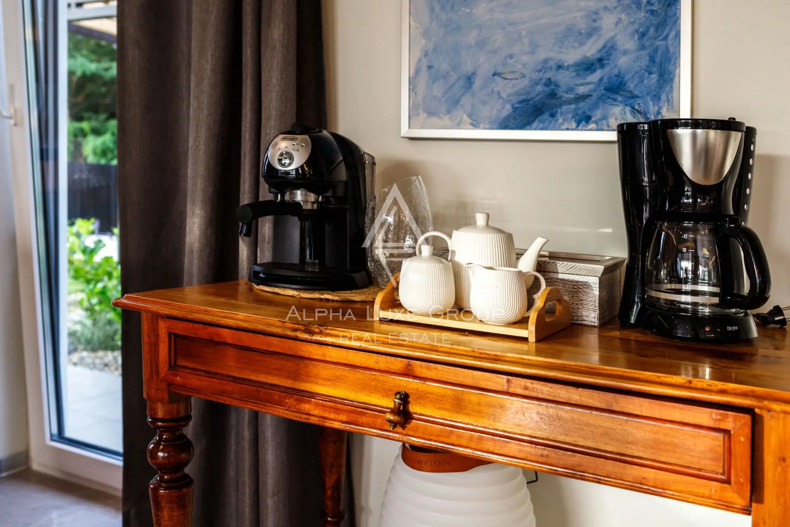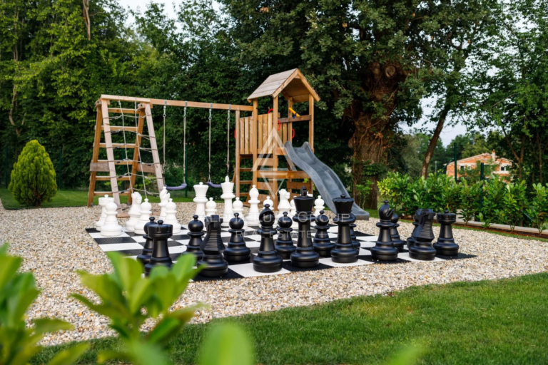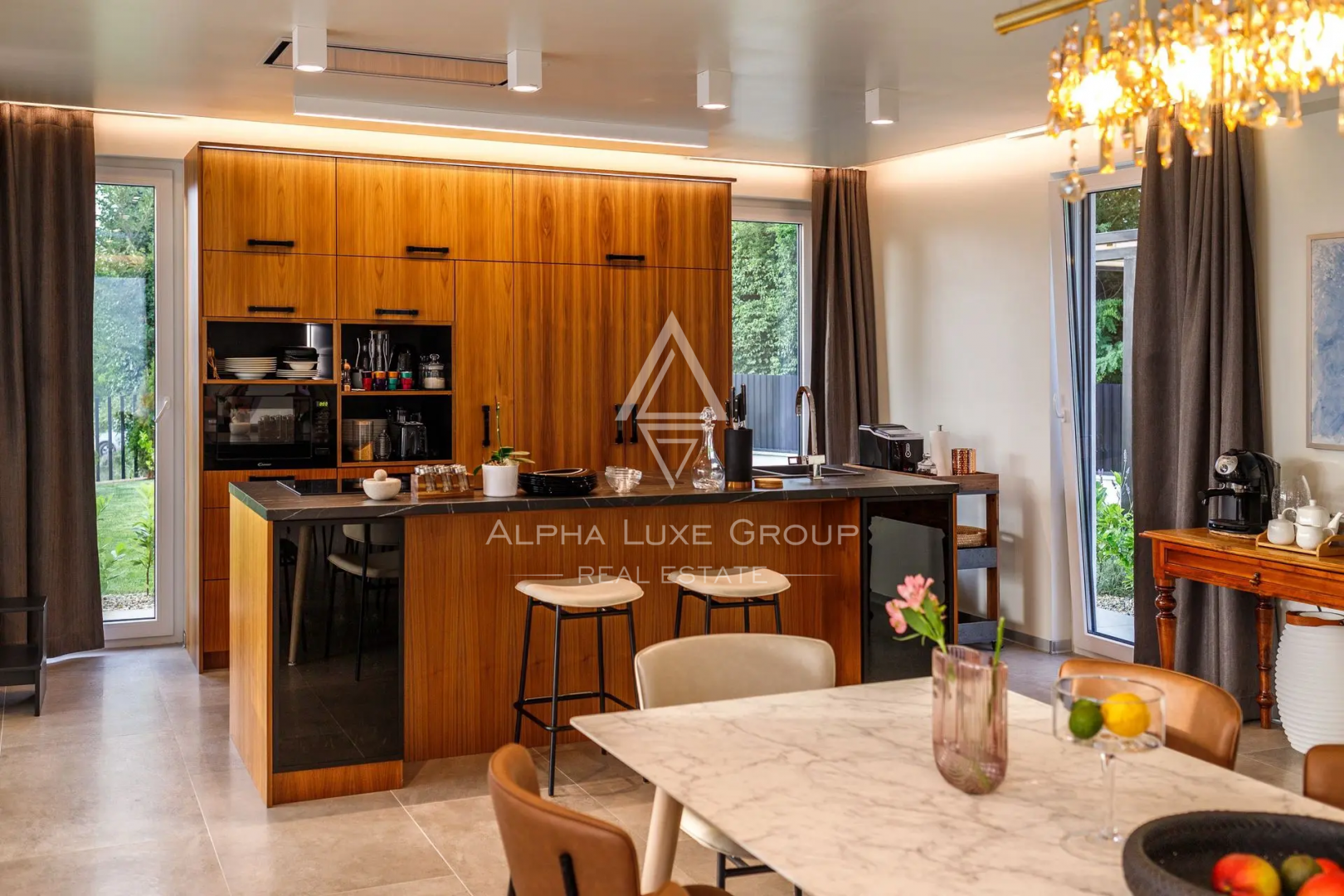 V přízemí se nachází světlý otevřený obývací pokoj s velkou Smart TV, PlayStationem a odpočinkovou zónou, propojený s jídelnou pro osm osob a plně vybavenou moderní kuchyní. Samostatná pracovna poskytuje klid i během dovolené.