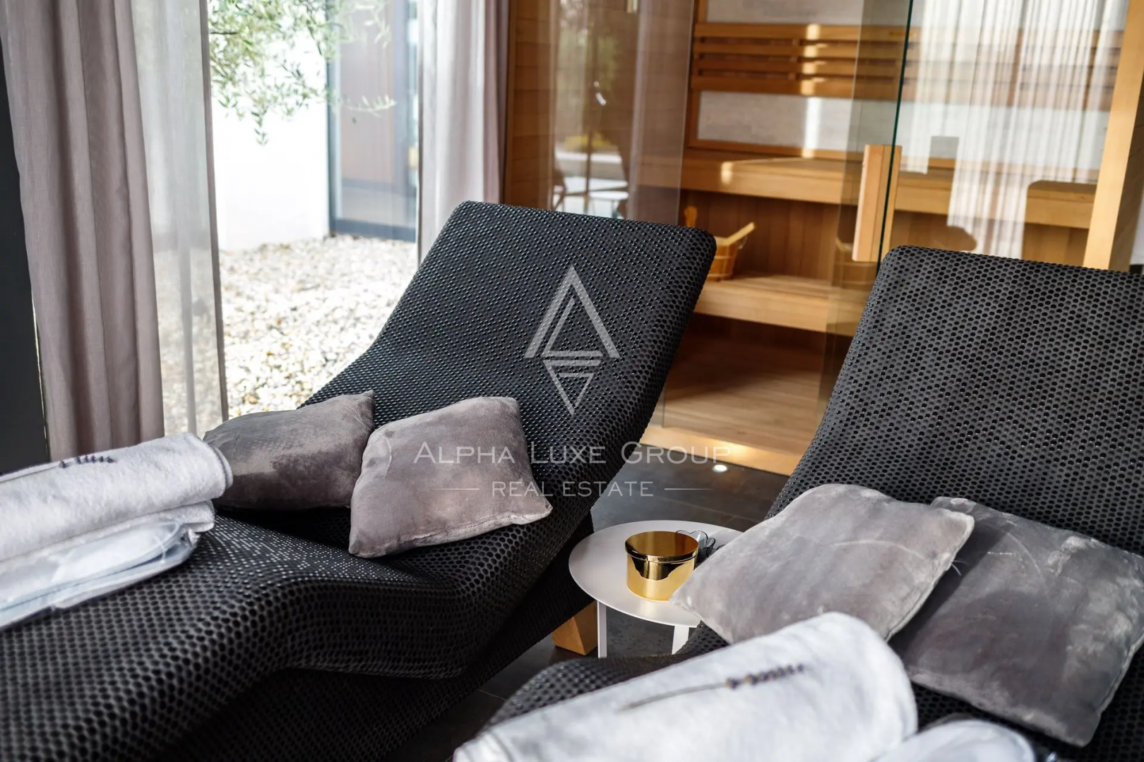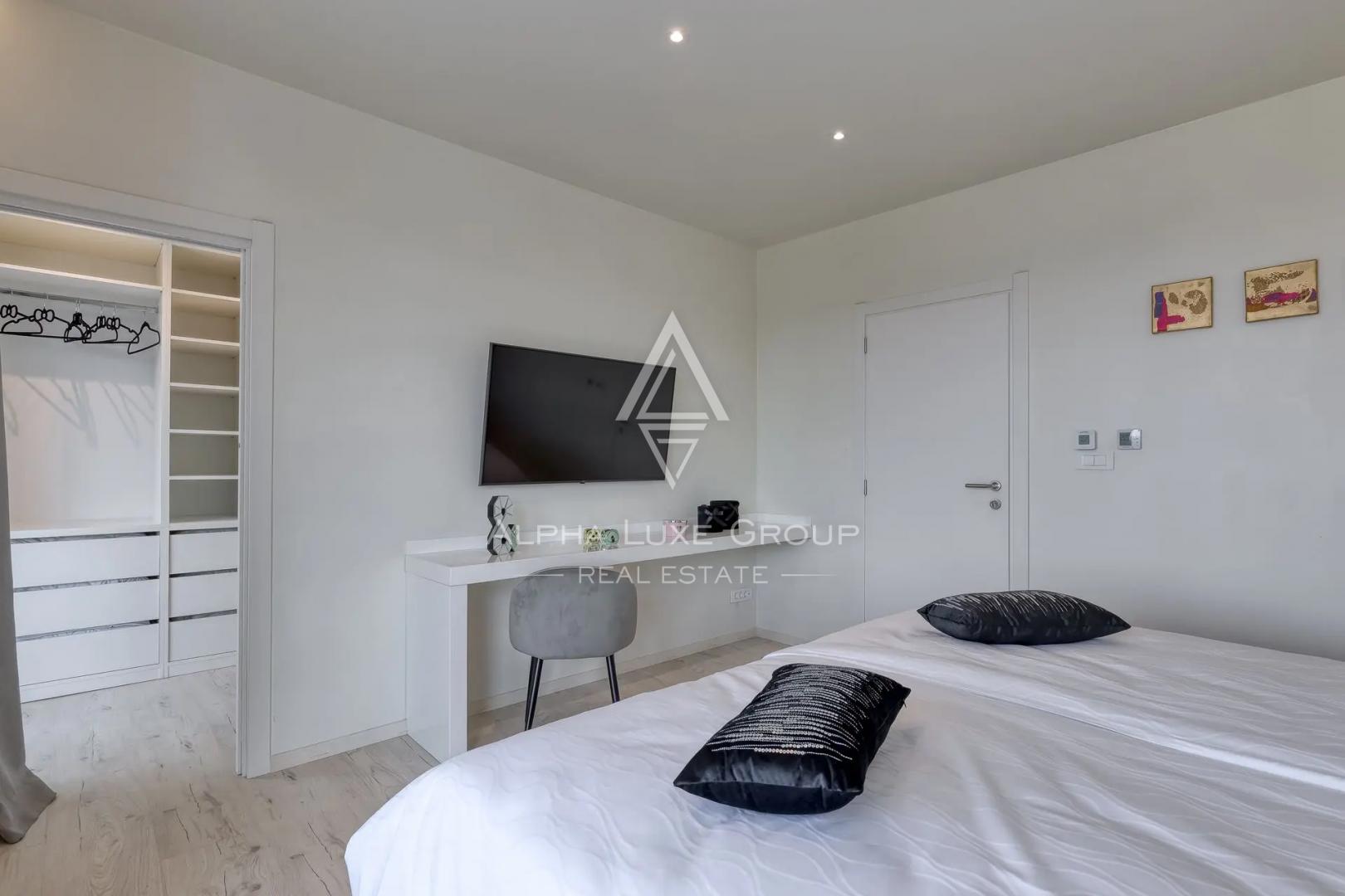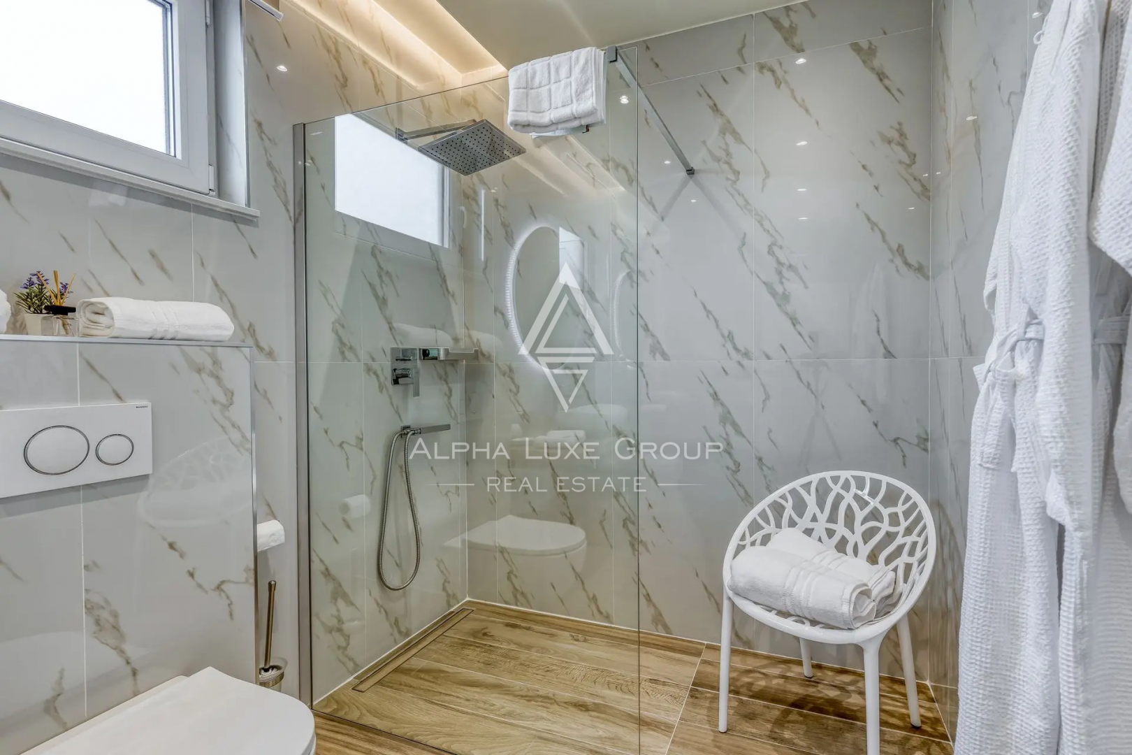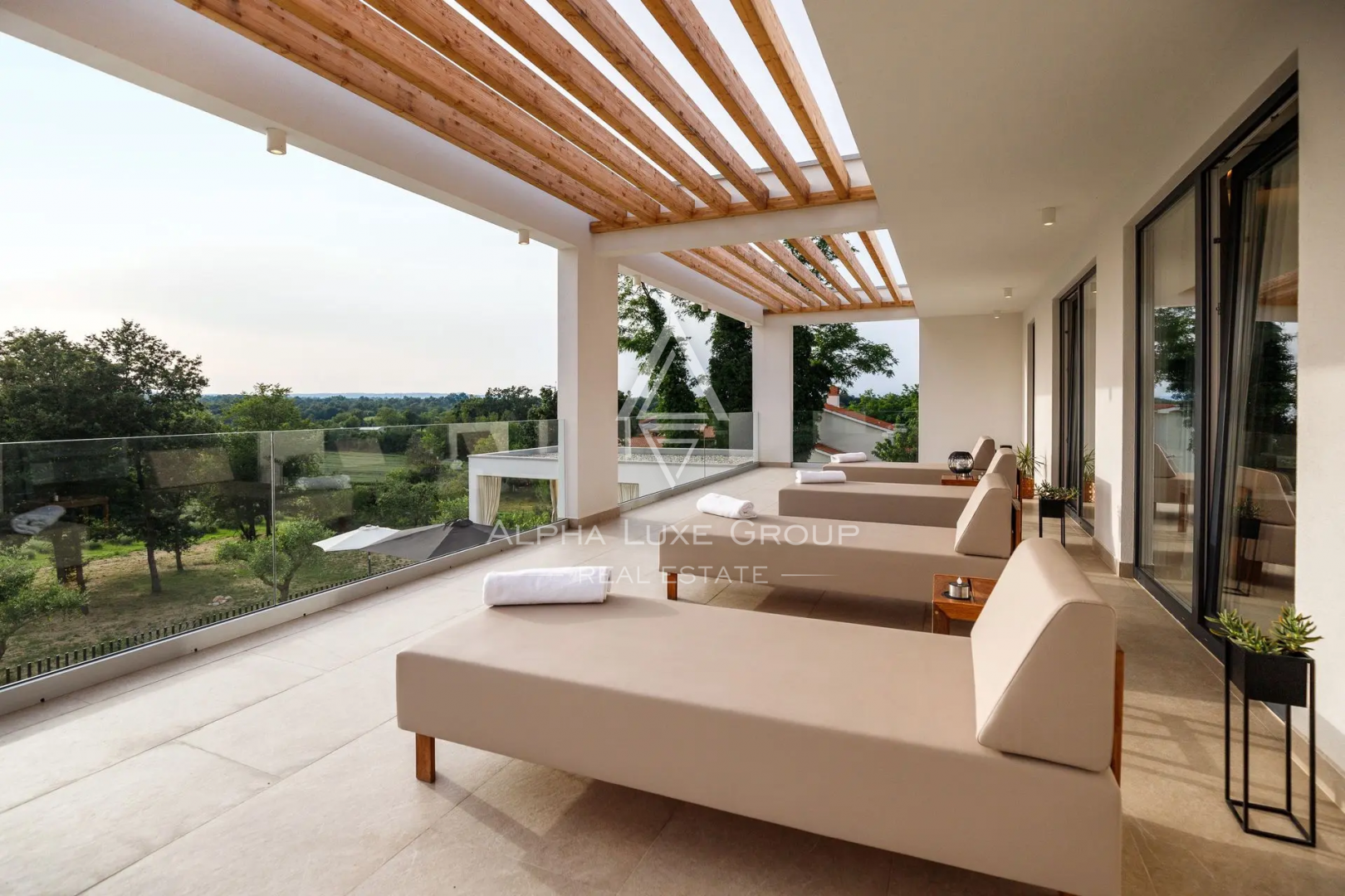 V patře se nacházejí další dvě ložnice s vlastními koupelnami, šatna a prostorná terasa s panoramatickým výhledem na olivovníky, vinice a levandulová pole.
