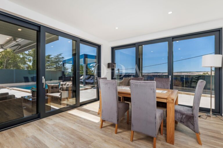 - Velké posuvné prosklené stěny vedoucí na slunnou terasu s bazénem.