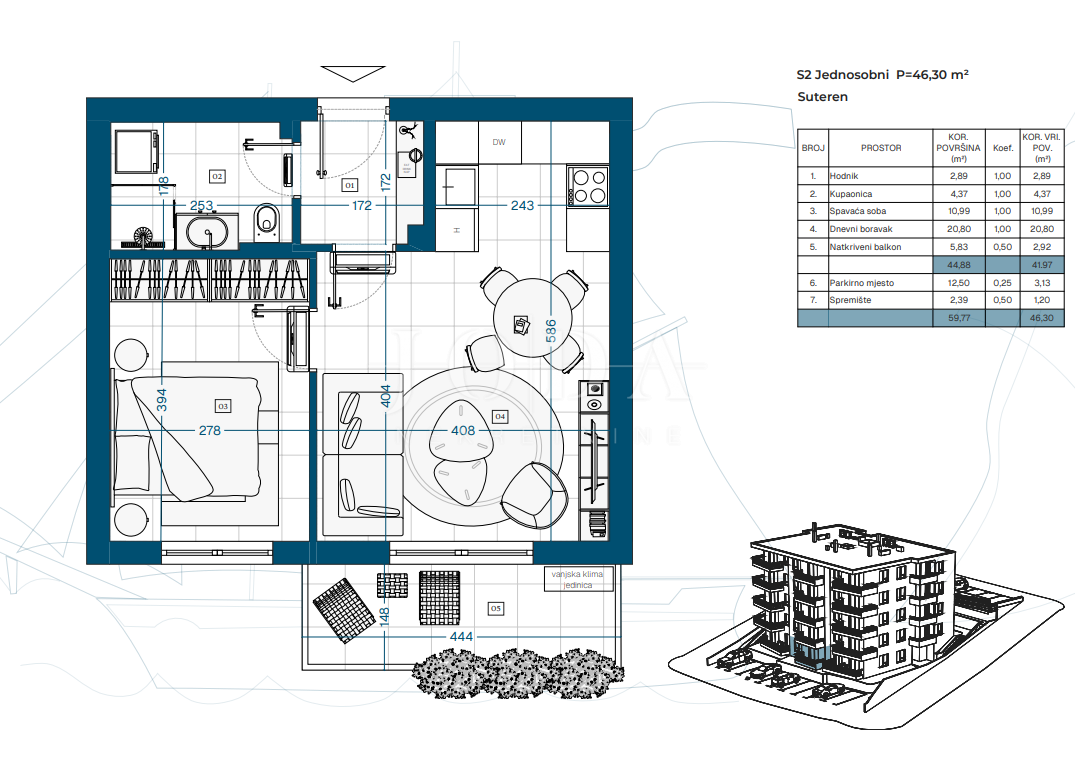 Byt S2 je komfortní byt s jednou ložnicí a celkovou rozlohou 45,66 m². Jeho funkční uspořádání zahrnuje: