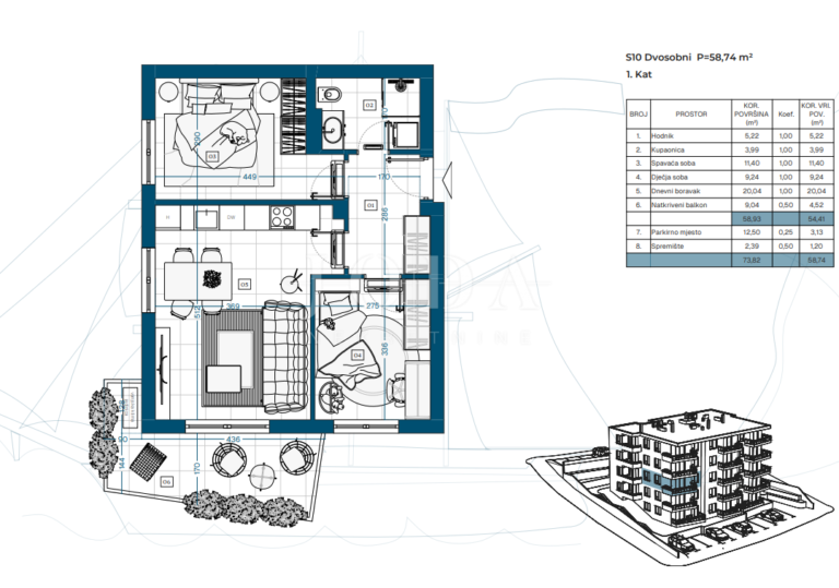 Projekt zahrnuje 23 funkčně řešených bytů, ideálních pro rodinný život, druhý domov u moře nebo dlouhodobou investici.