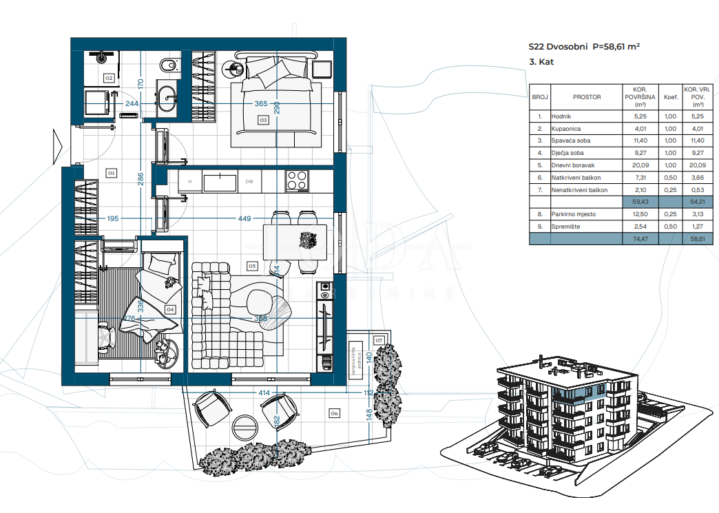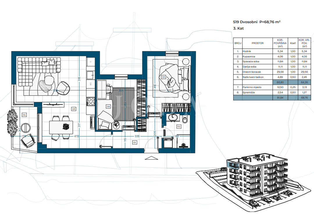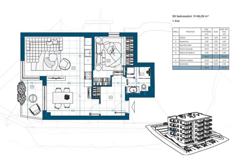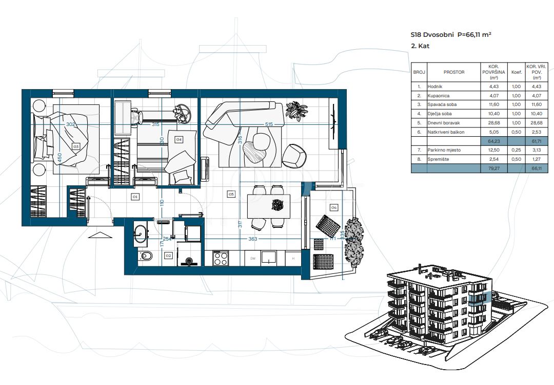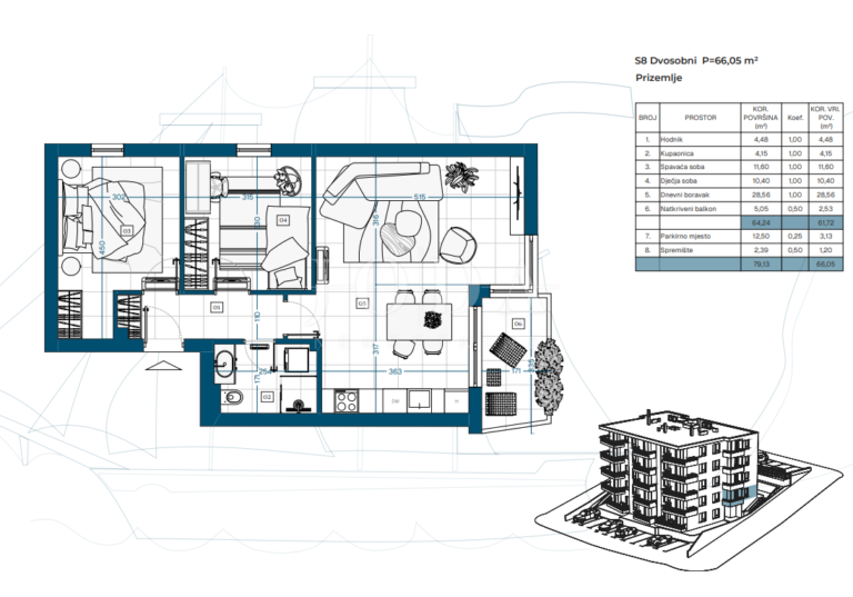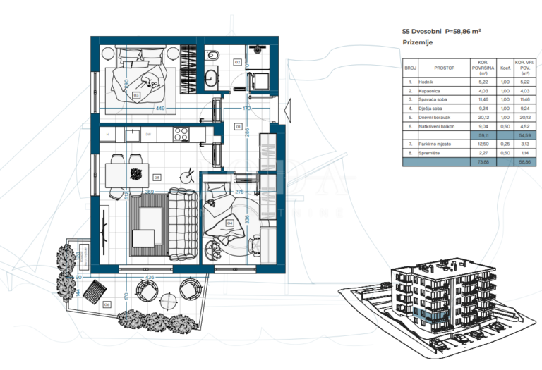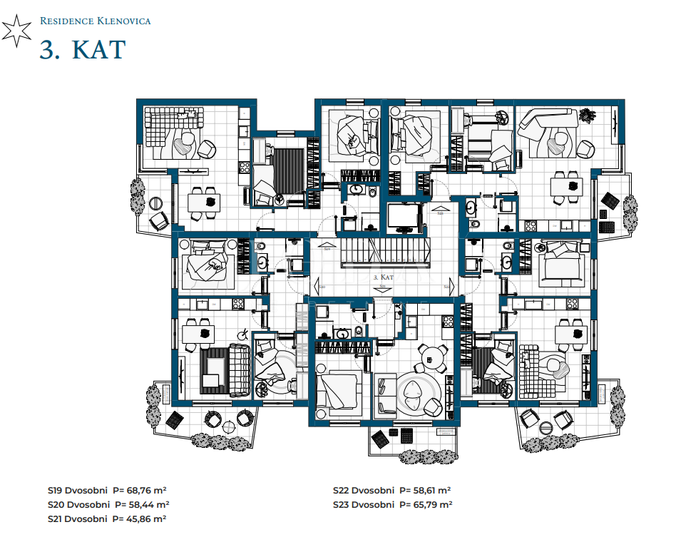 Projekt zahrnuje suterén, přízemí a tři patra s celkem 23 funkčně řešenými byty, ideálními pro rodinný život, druhý domov u moře nebo dlouhodobou investici.