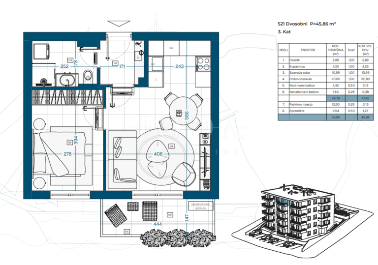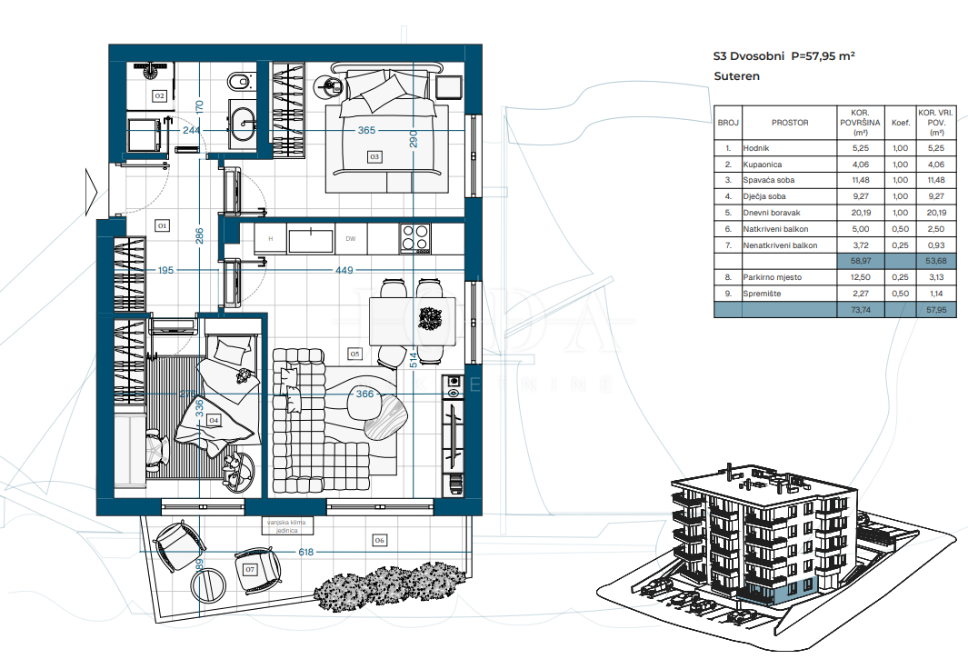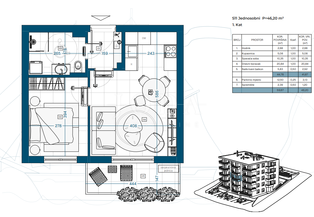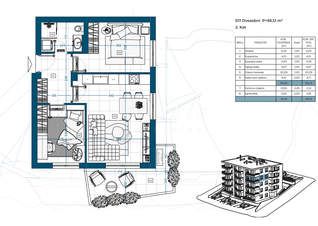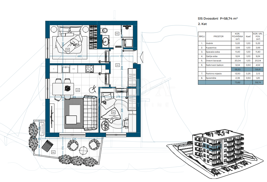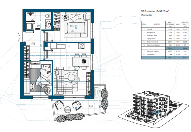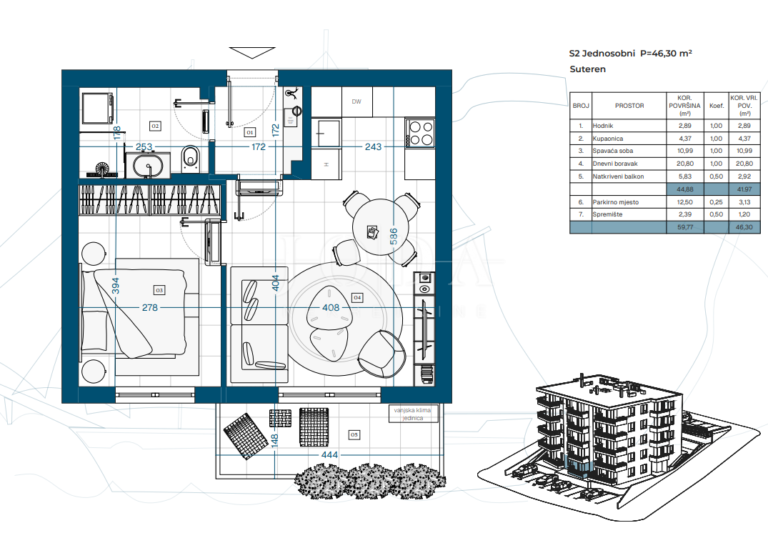Projekt zahrnuje suterén, přízemí a tři patra s celkem 23 funkčně řešenými byty, ideálními pro rodinný život, druhý domov u moře nebo dlouhodobou investici.