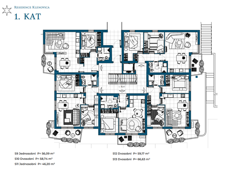 Byt S9 se nachází v prvním patře a má rozlohu 55,45 m². Je světlý a funkční, ideální pro klidný život nebo investici.