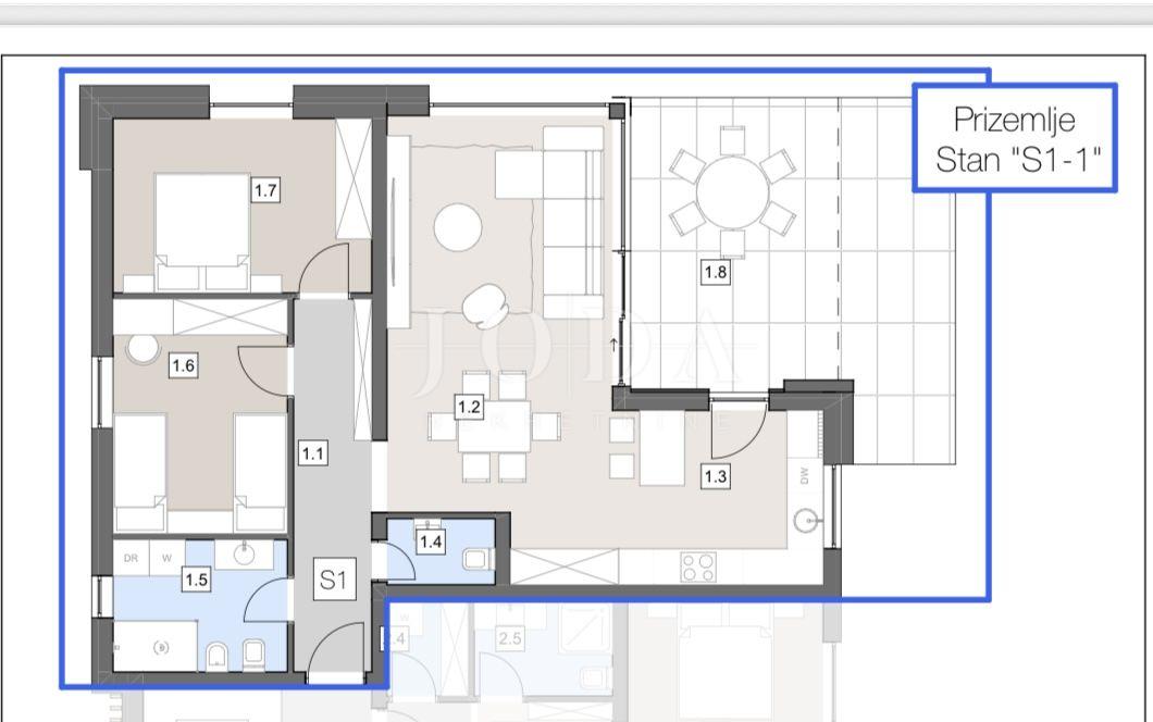 Prodává se dvoupokojový byt v přízemí nové, moderní městské vily, který nabízí pohodlné a funkční bydlení.