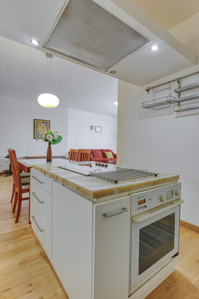 - Velký otevřený obývací pokoj a kuchyně s ostrůvkem a osvětlenou onyxovou deskou.