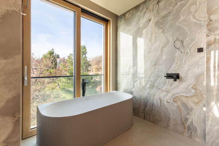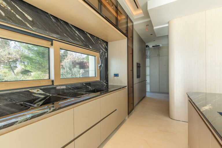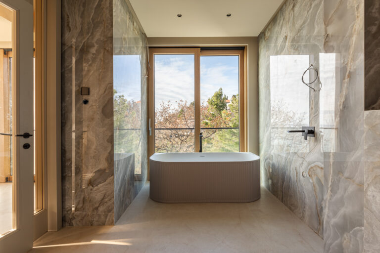 Vila je navržena ve třech promyšleně uspořádaných podlažích a zajišťuje maximální komfort a funkčnost. Disponuje sedmi velkými ložnicemi, každá s vlastní koupelnou, a světlou obývací částí s krbem, která je ideální pro klidné večery.