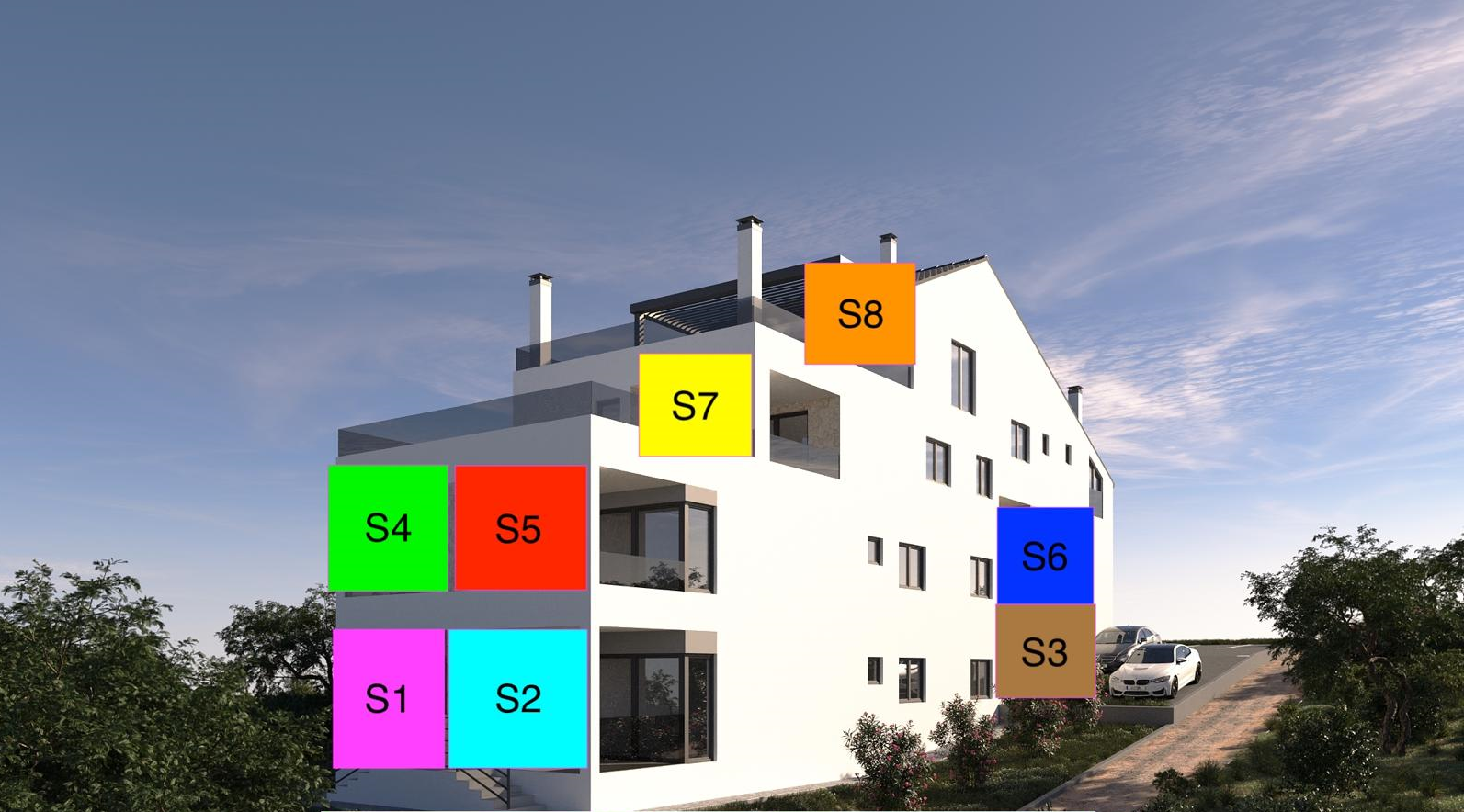 Apartmán se 3 ložnicemi, 2 koupelnami, otevřeným obývacím prostorem a přístupem na impozantní terasu o rozloze 45 m² s panoramatickým výhledem na moře a okolí.
