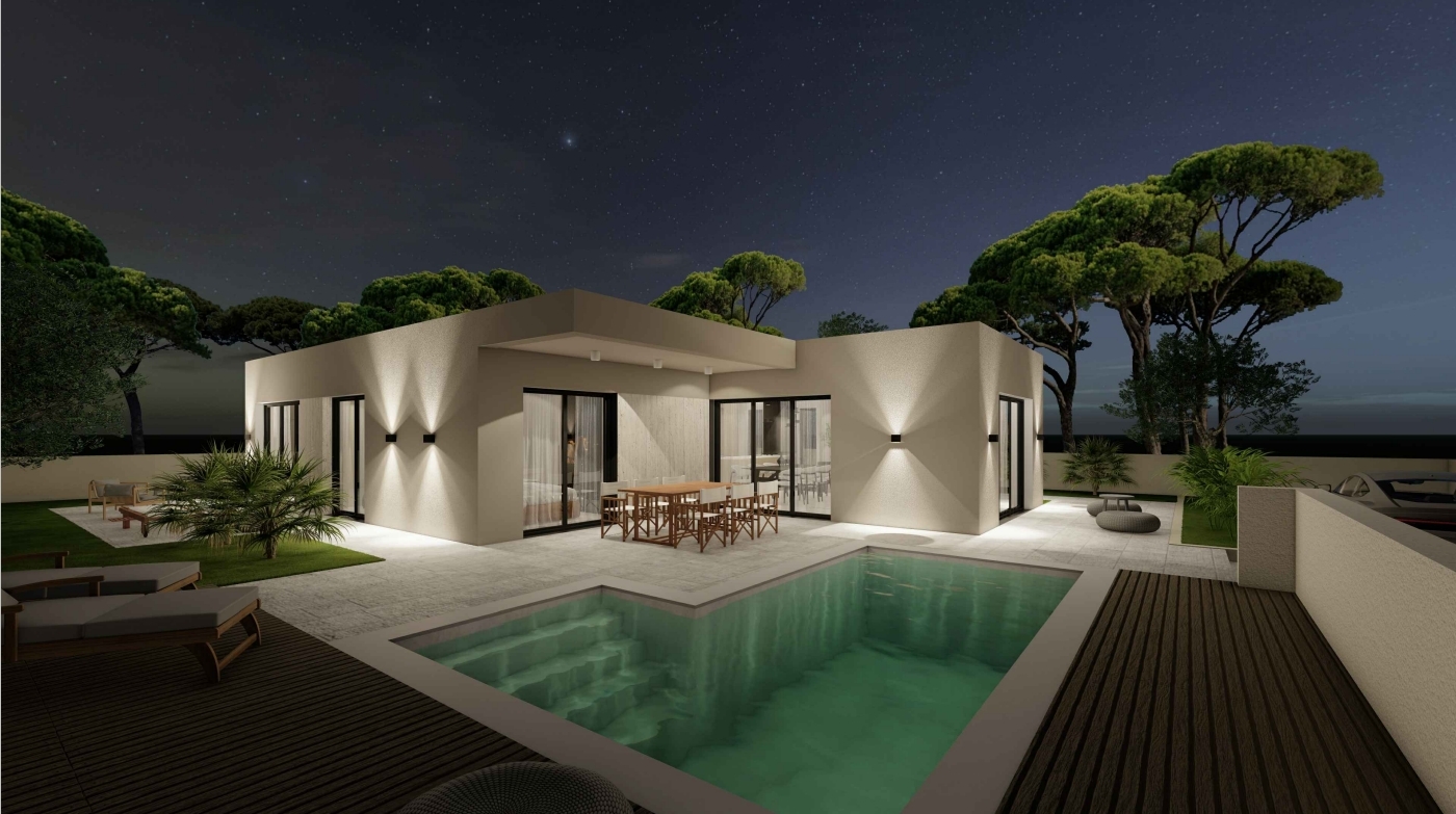 - Vyhřívaný bazén (20 m²) se schodištěm, obklopený dlážděnou zahradou, kterou lze využívat téměř celoročně.