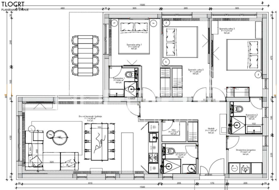 - Prostorný obývací pokoj (35 m²) s kuchyní a jídelnou, vedoucí na krytou terasu (10 m²).