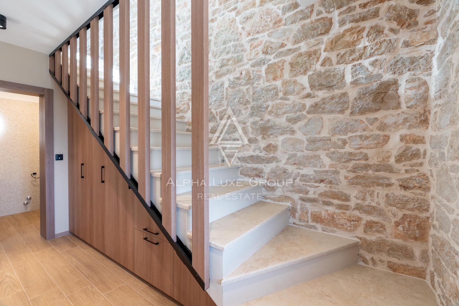 Nemovitost se rozkládá na ploše 137,58 m² na třech podlažích, propojených elegantním vnitřním schodištěm se skleněnou stěnou, která vnáší další světlo a zdůrazňuje kombinaci moderního designu a tradičních kamenných zdí.