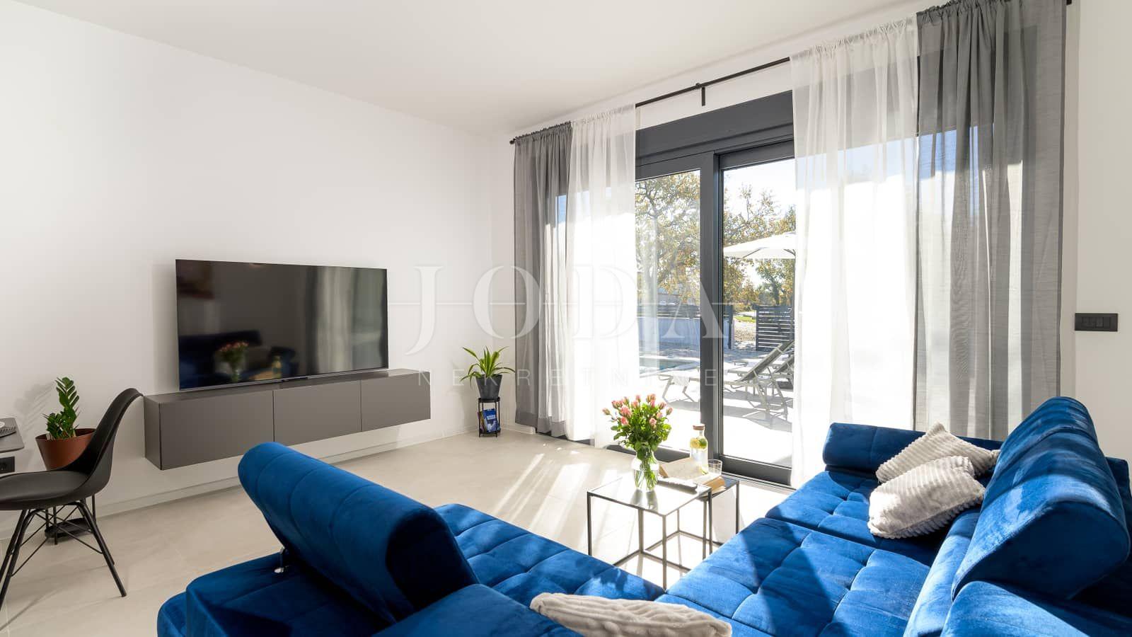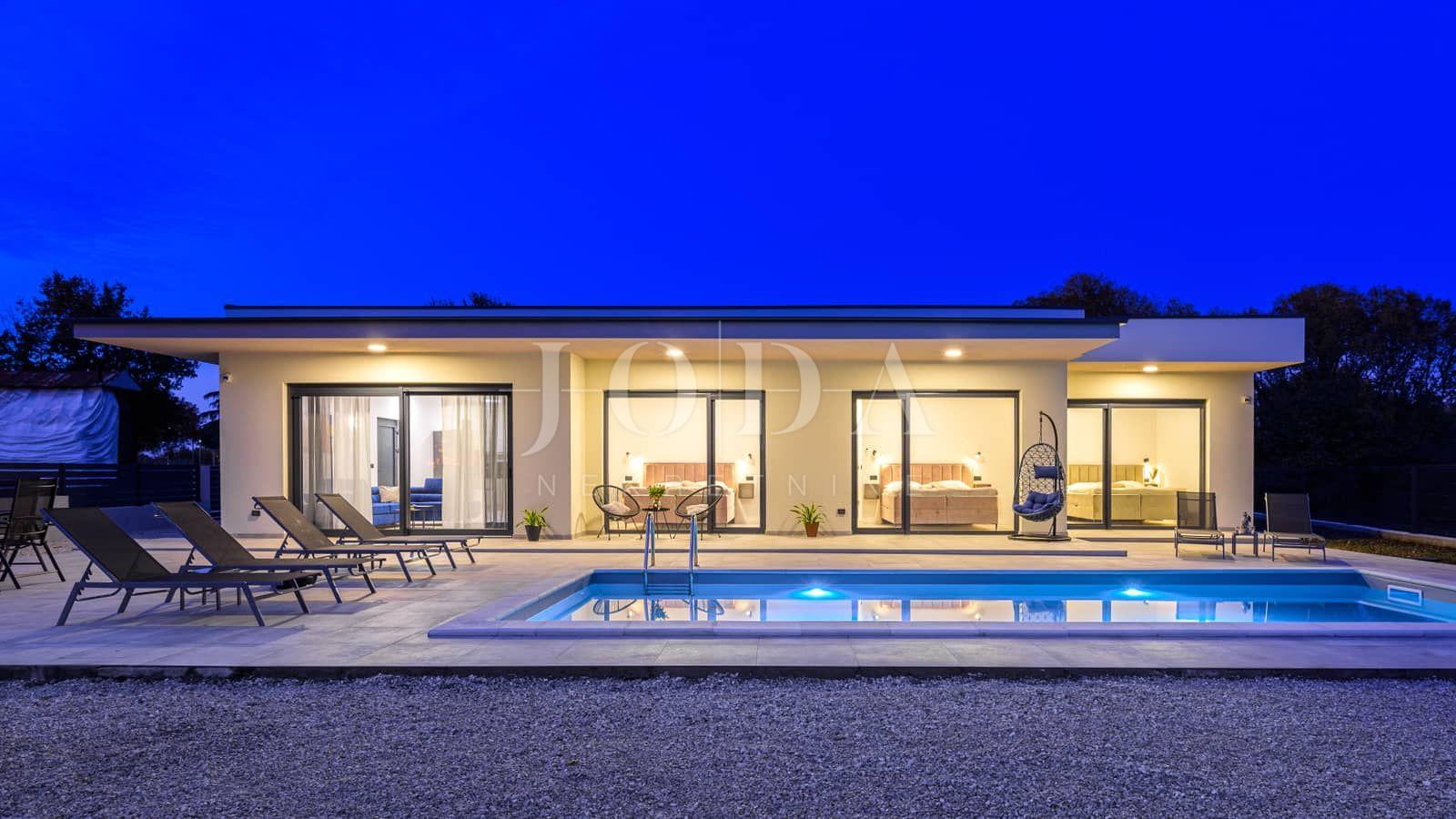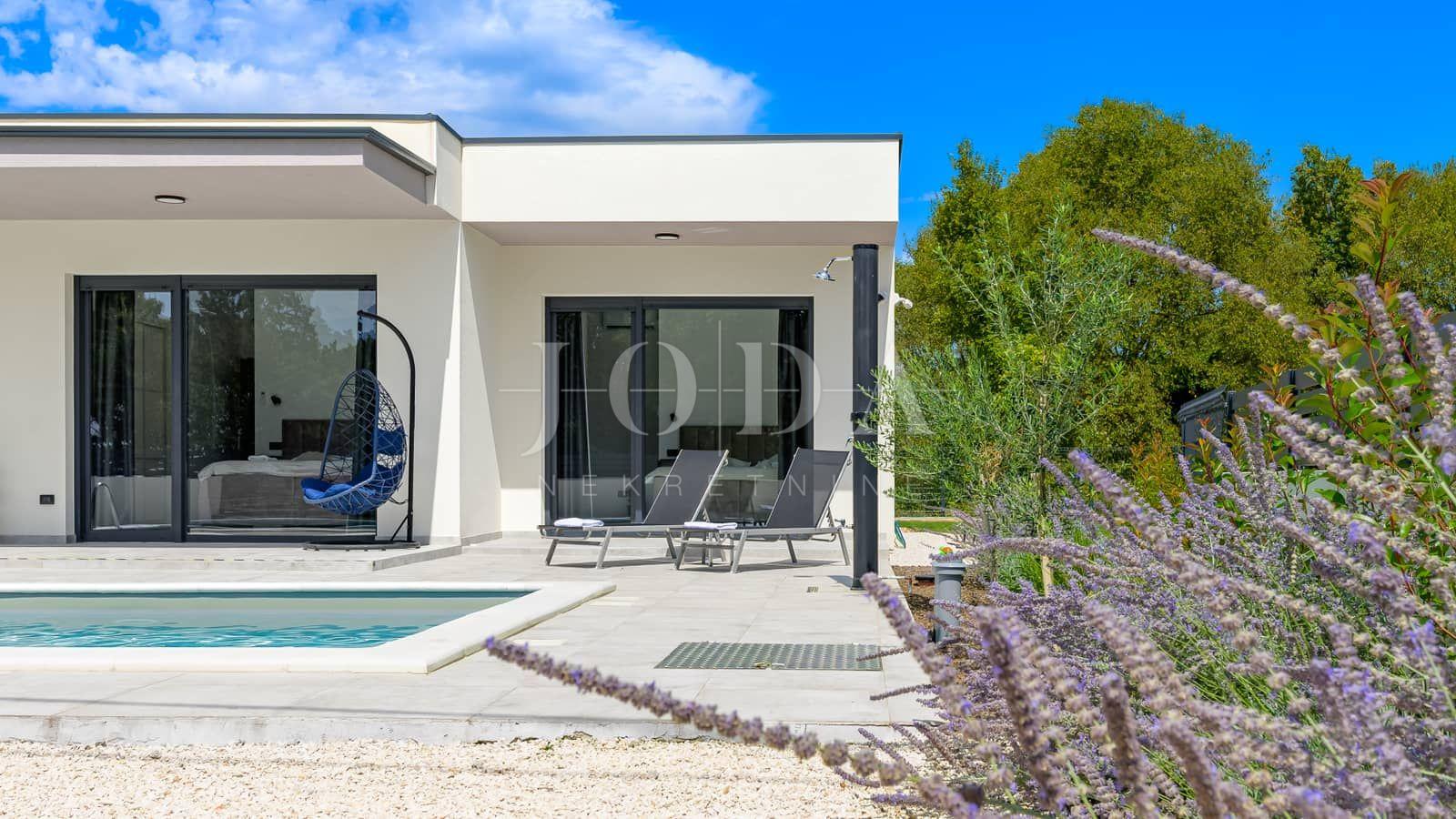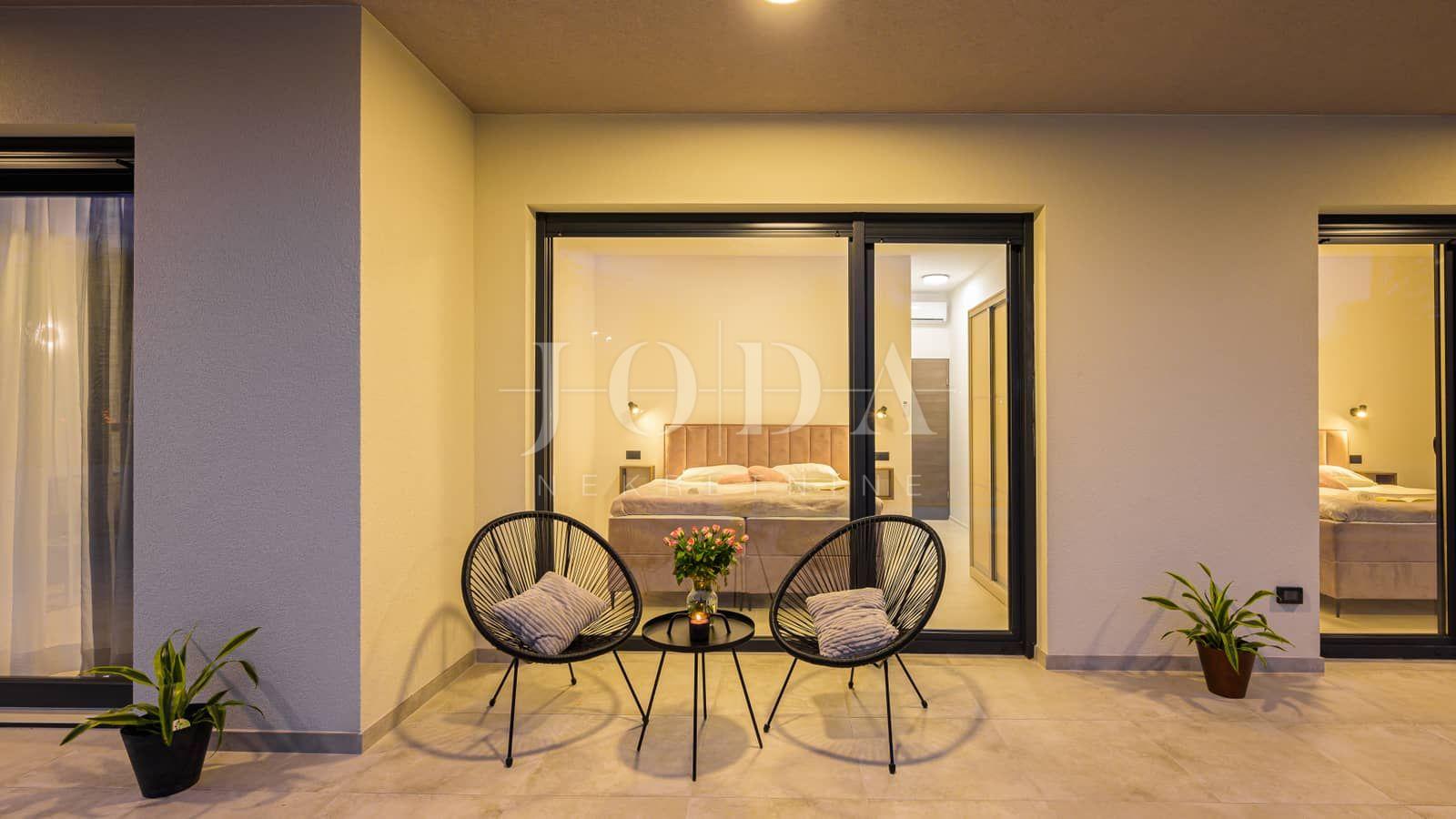 Pokoje jsou slunné s velkými prosklenými stěnami, které vedou na prostornou terasu s krytou letní kuchyní a místem na opalování s lehátky a bazénem.