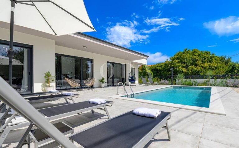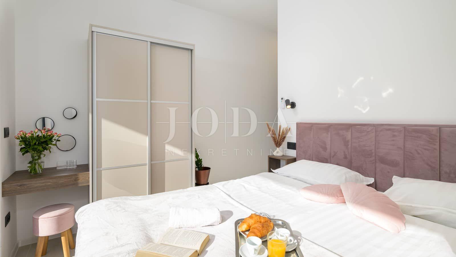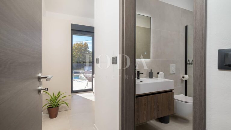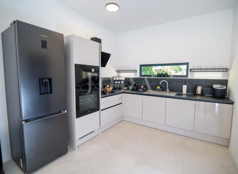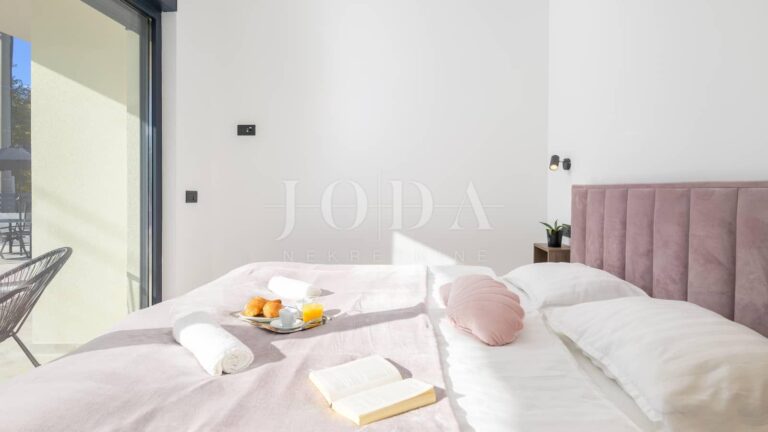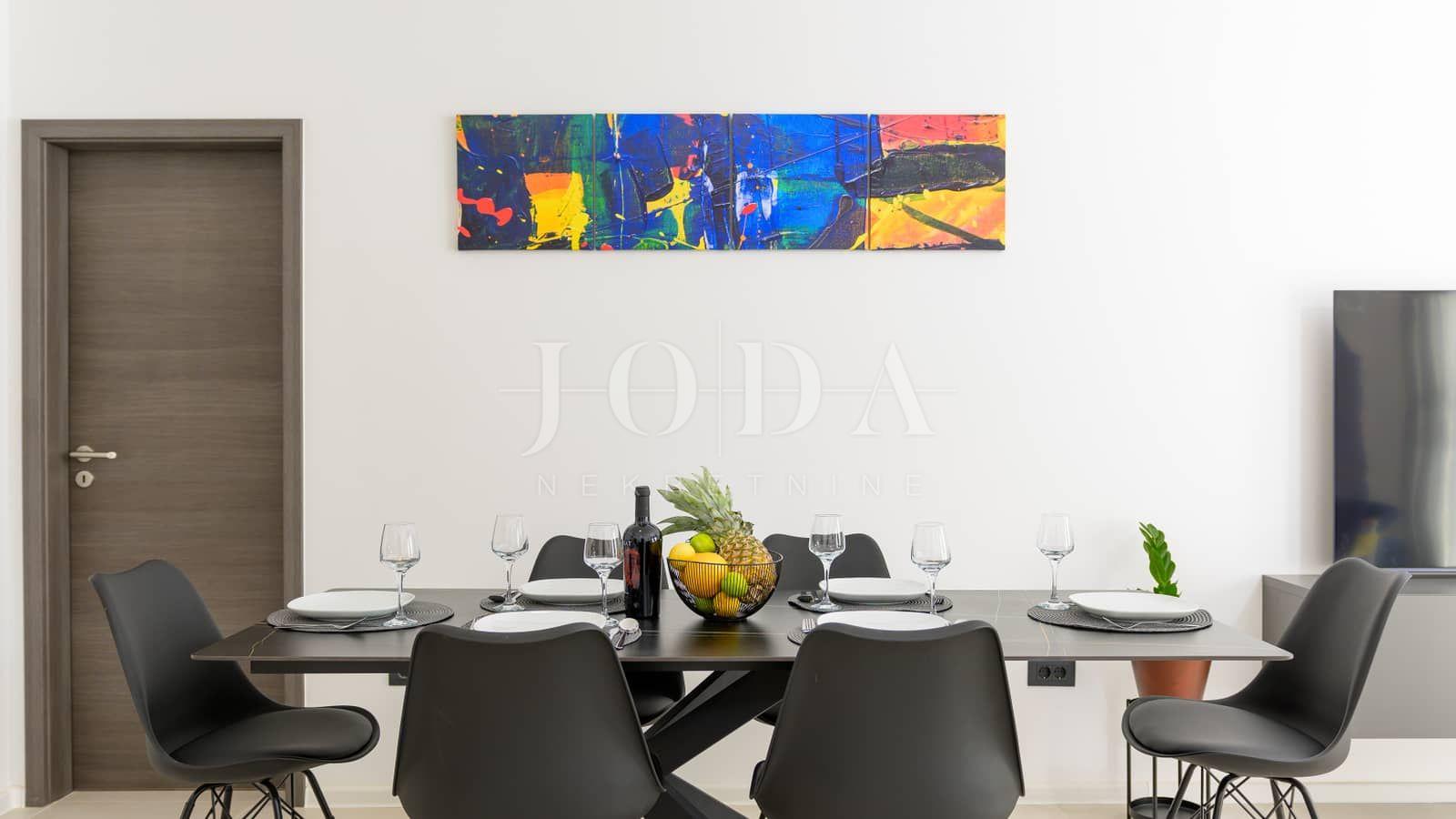Pokoje jsou slunné s velkými prosklenými stěnami, které vedou na prostornou terasu s krytou letní kuchyní a místem na opalování s lehátky a bazénem.