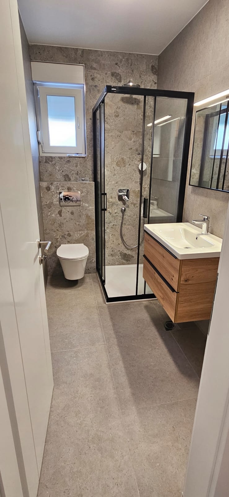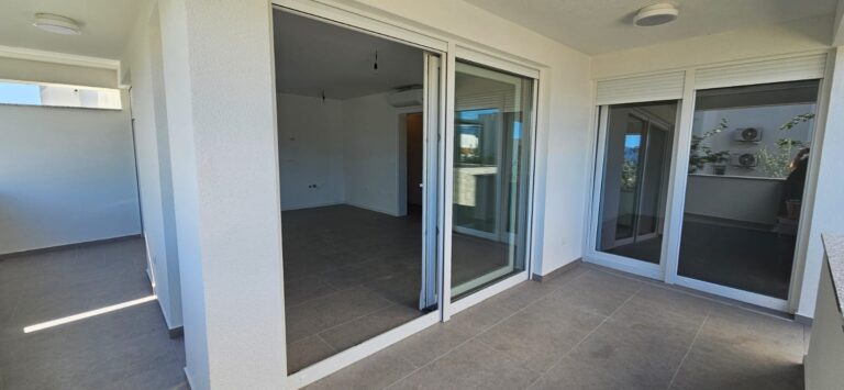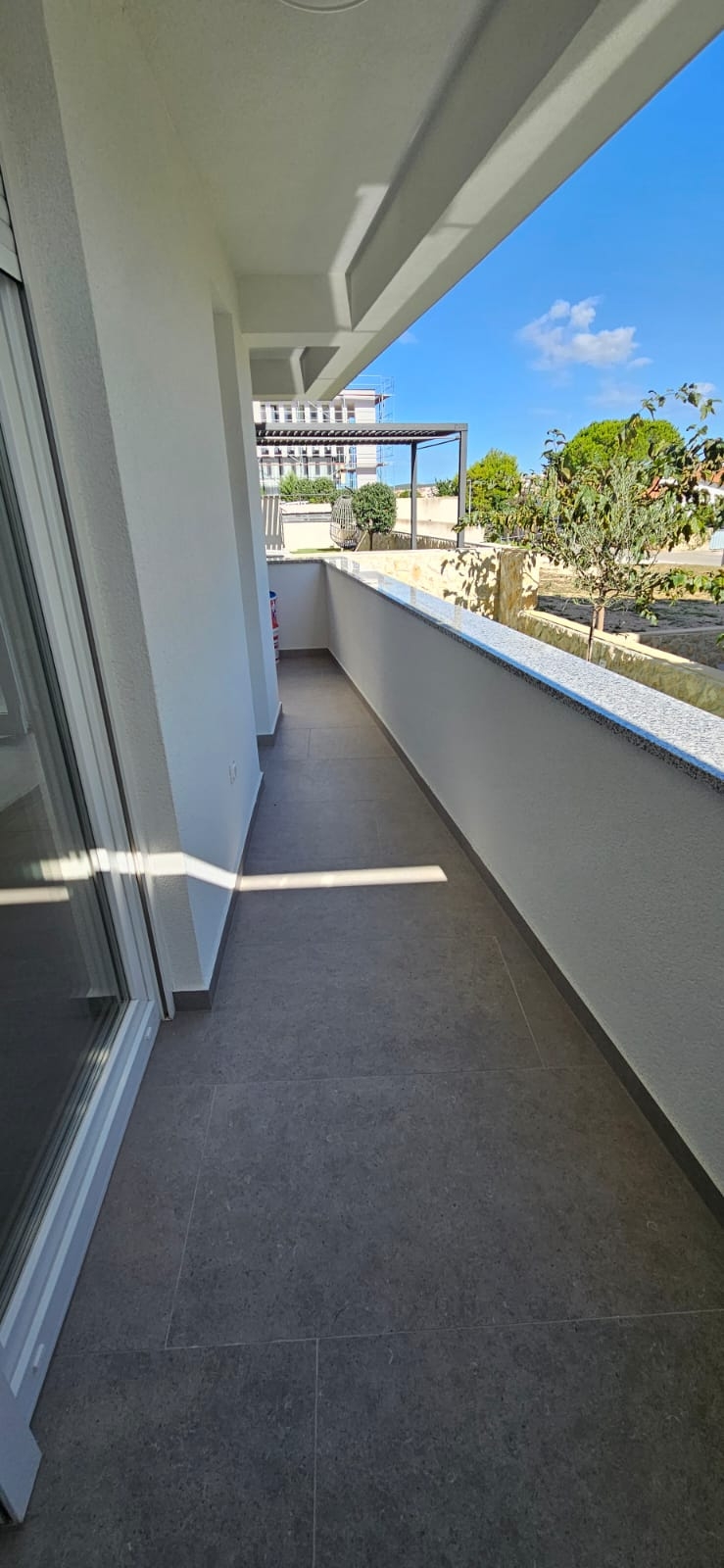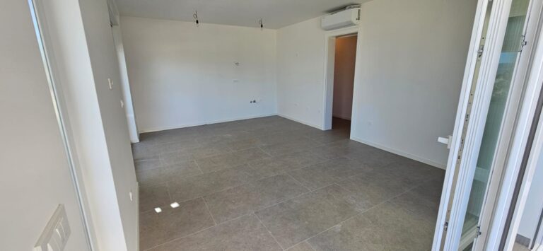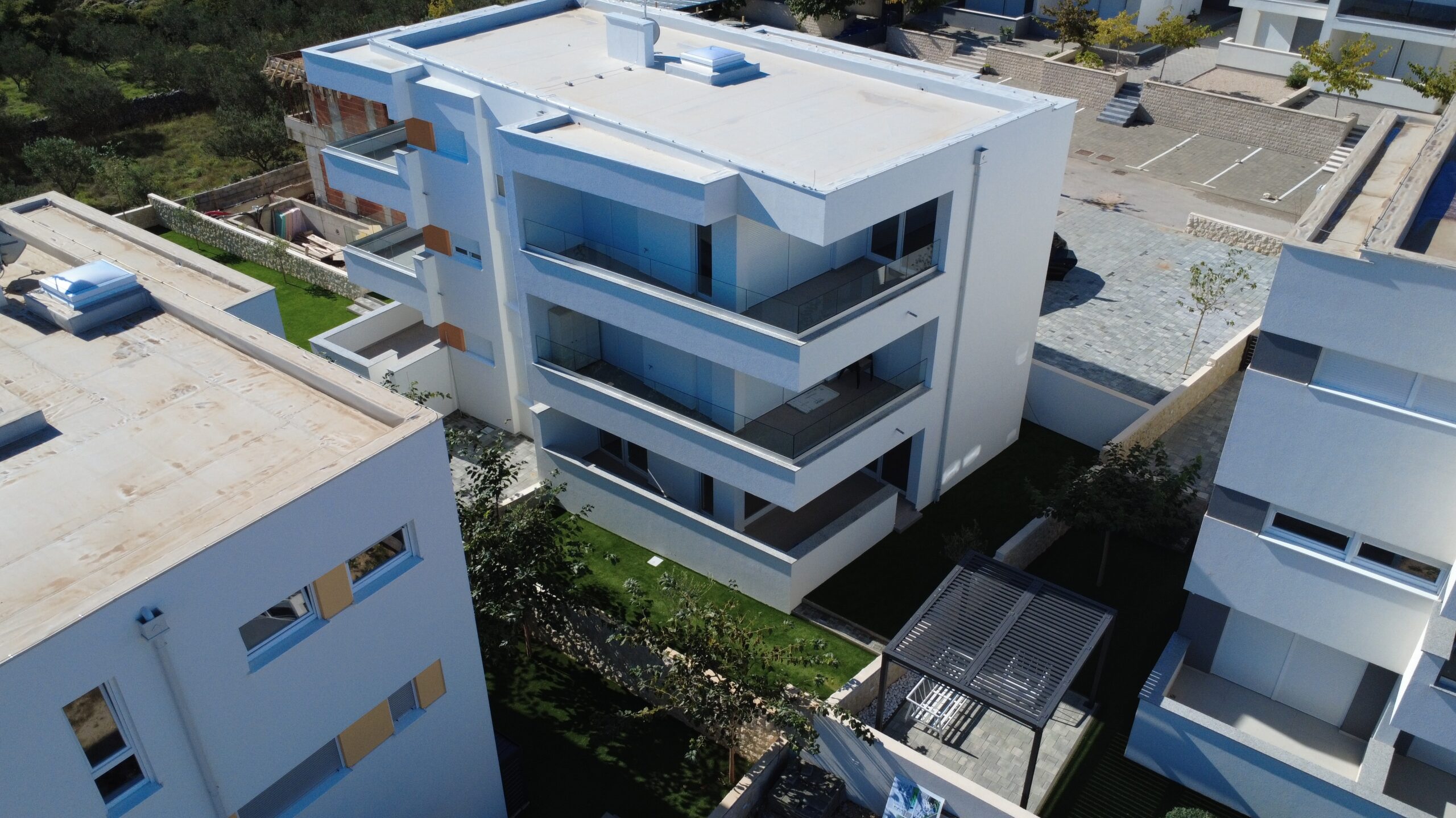 Nabízíme k prodeji třípokojový byt v přízemí moderní novostavby, pouhých 400 m od moře. Byt má vlastní zahradu a dvě parkovací místa, takže je ideální pro rodinné bydlení nebo turistický pronájem.