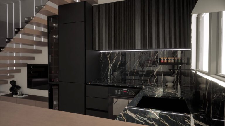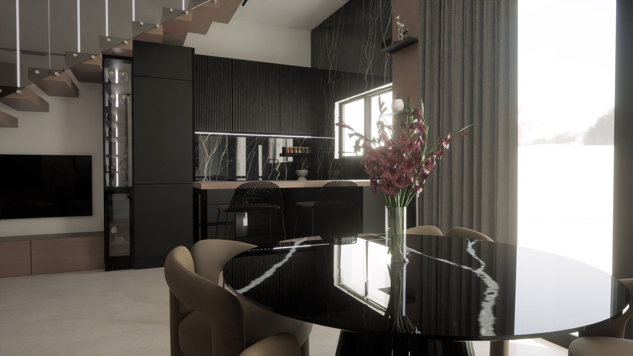 - Otevřený prostor kuchyně, jídelny a obývacího pokoje