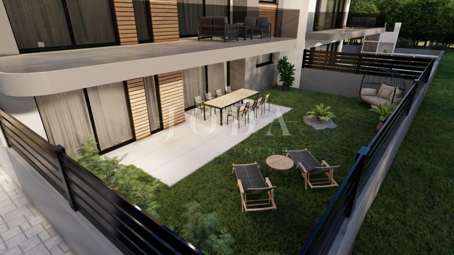 Novostavba, přízemí bytu v 6bytovém domě. Cena se vztahuje k aktuální fázi výstavby. Byt má obytnou plochu 90 m2 + úložný prostor a sklep + jedno parkovací místo. Byt se skládá z chodby, technické místnosti, dvou koupelen, dvou ložnic a otevřeného prostoru obývacího pokoje, kuchyně a jídelny, který vede přes velké prosklené stěny do oplocené zahrady. Po dvou stranách budovy se nachází zelená plocha, kde se 25 let nestavělo. Atraktivní lokalita v blízkosti pláží Borik a Amarin (650 metrů od moře). Vynikající příležitost k investici.