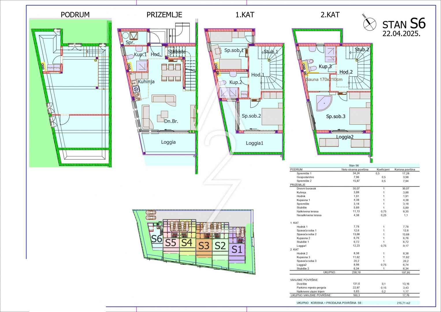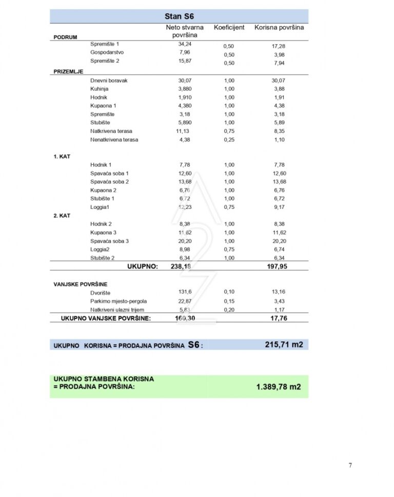 Bytová jednotka S6 má čistou obytnou plochu 215,71 m2 a skládá se z: