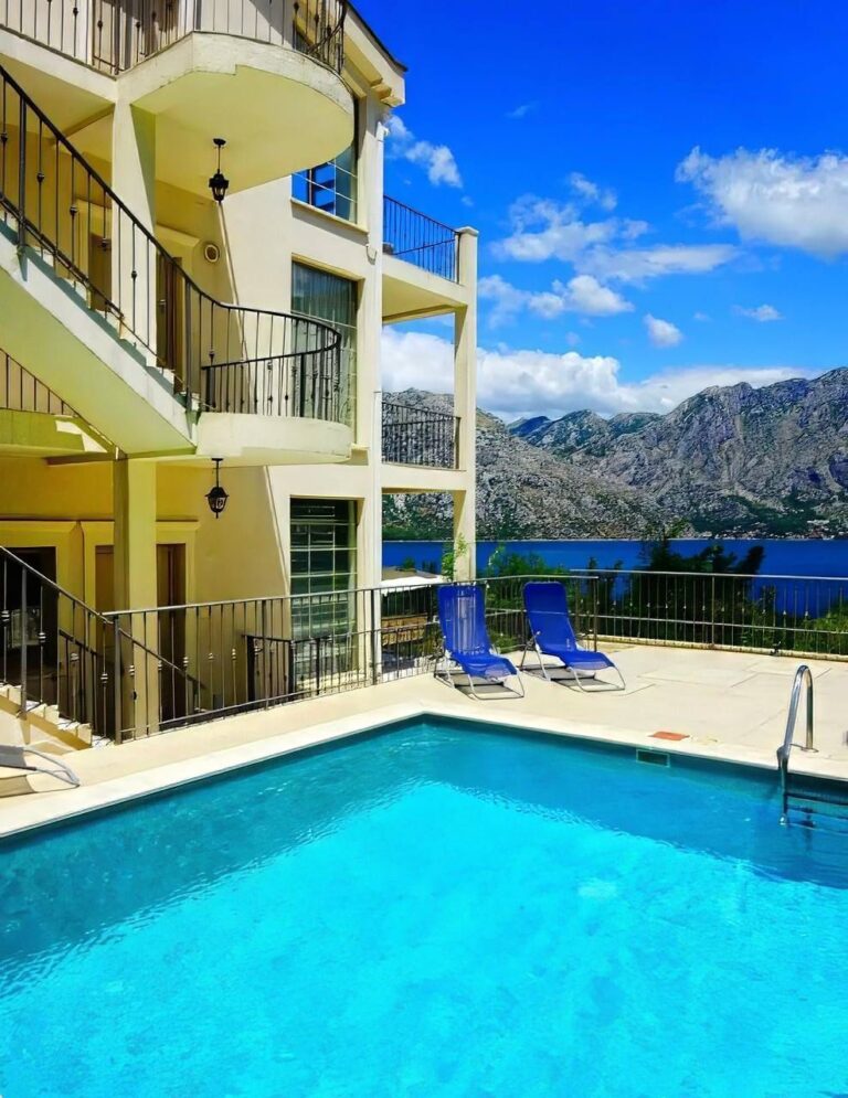 Prcanj, Kotor – Prostorné apartmány s 1 ložnicí, terasou a neuvěřitelným přímým výhledem na Kotorský záliv. Součástí komplexu je bazén a garáž. Ideální pro bydlení nebo dovolenou.