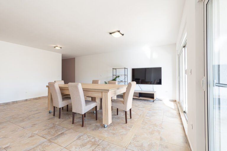 Apartmán je plně zařízený a připravený k nastěhování. Obývací prostor zahrnuje kulečníkový stůl, který dodává eleganci a je ideálním místem pro relaxaci a zábavu.