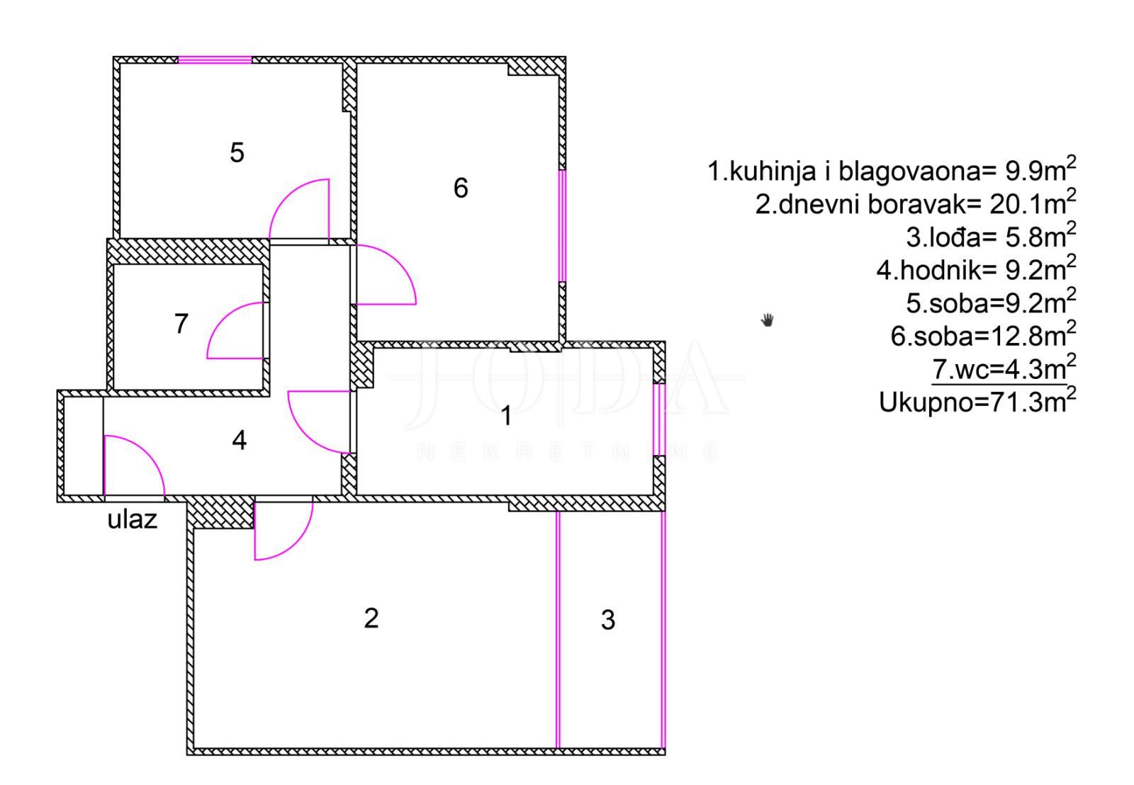 Dispozice pokojů je velmi funkční a existuje také možnost snadné přestavět obývací pokoj na třetí pokoj, což činí byt mimořádně atraktivním k pronájmu pro studenty díky blízkosti Právnické fakulty v Rijece a neustálé poptávce po ubytování v této oblasti.