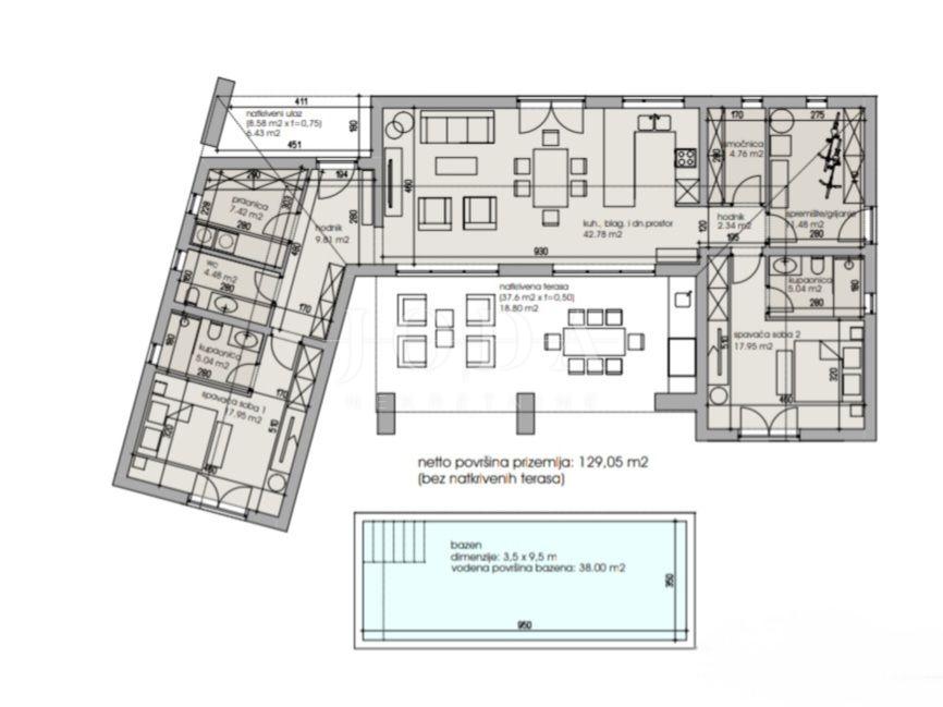 Projekt počítá s výstavbou vily o celkové rozloze 129 m² obytné plochy, k níž se přidává 38 m² kryté terasy a 8 m² krytého vchodu.