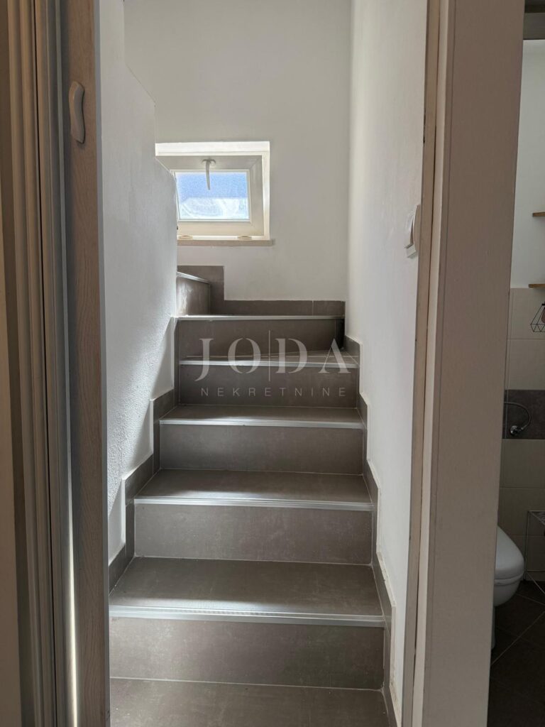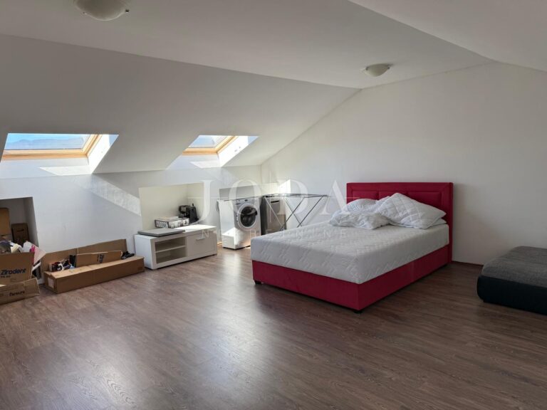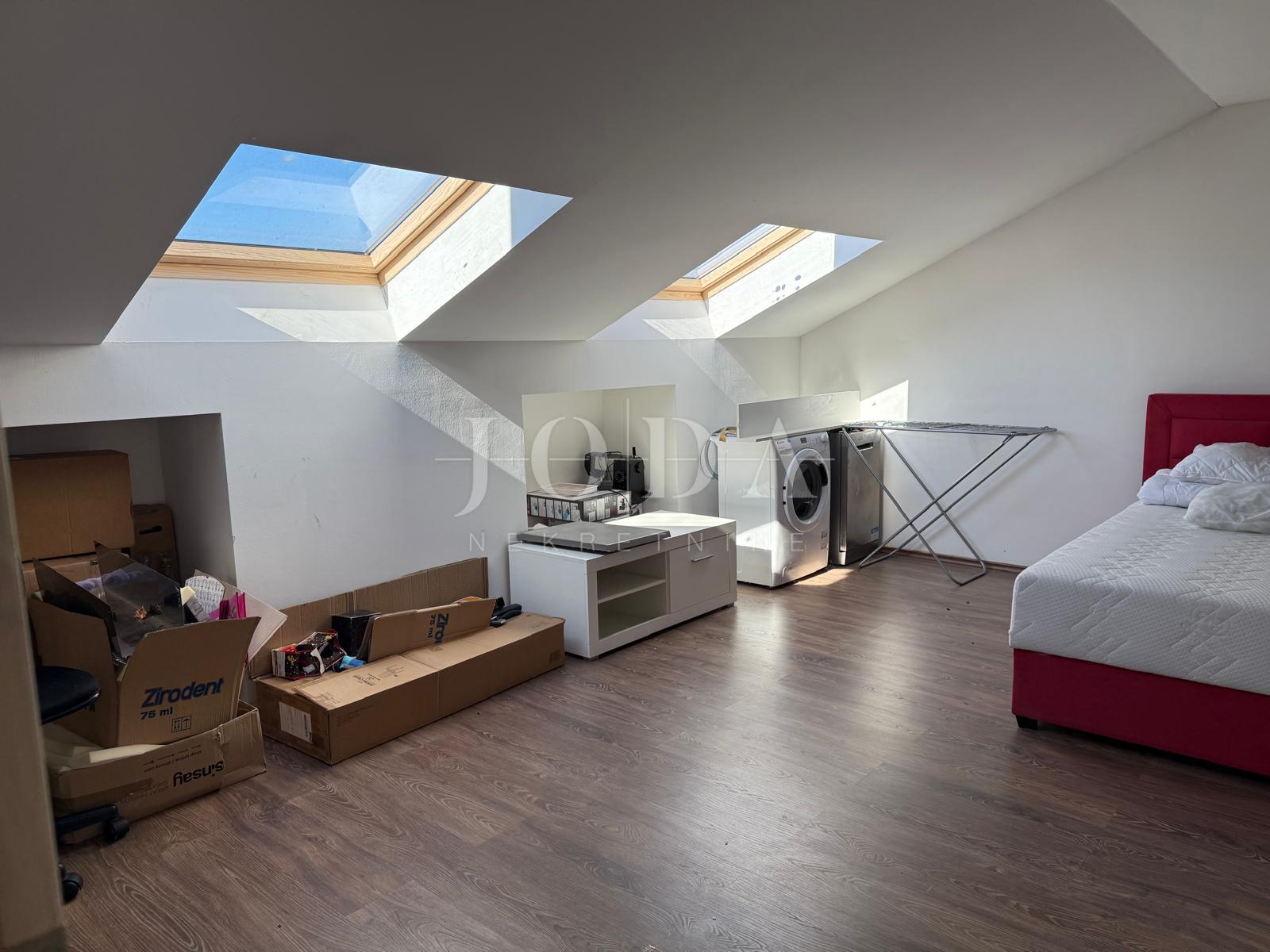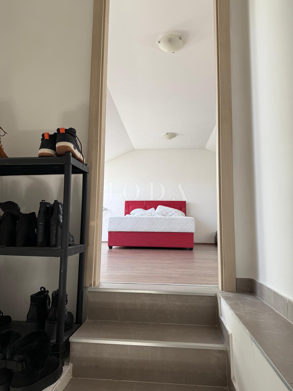 Vnitřní schodiště vede do prvního patra, které skýtá velký potenciál. Zde je možné vytvořit další byt o dispozici 1+kk s obývacím pokojem. Tento prostor má dobrou výšku stropu a je vybaven střešním oknem, což zaručuje světlost a vzdušnost.