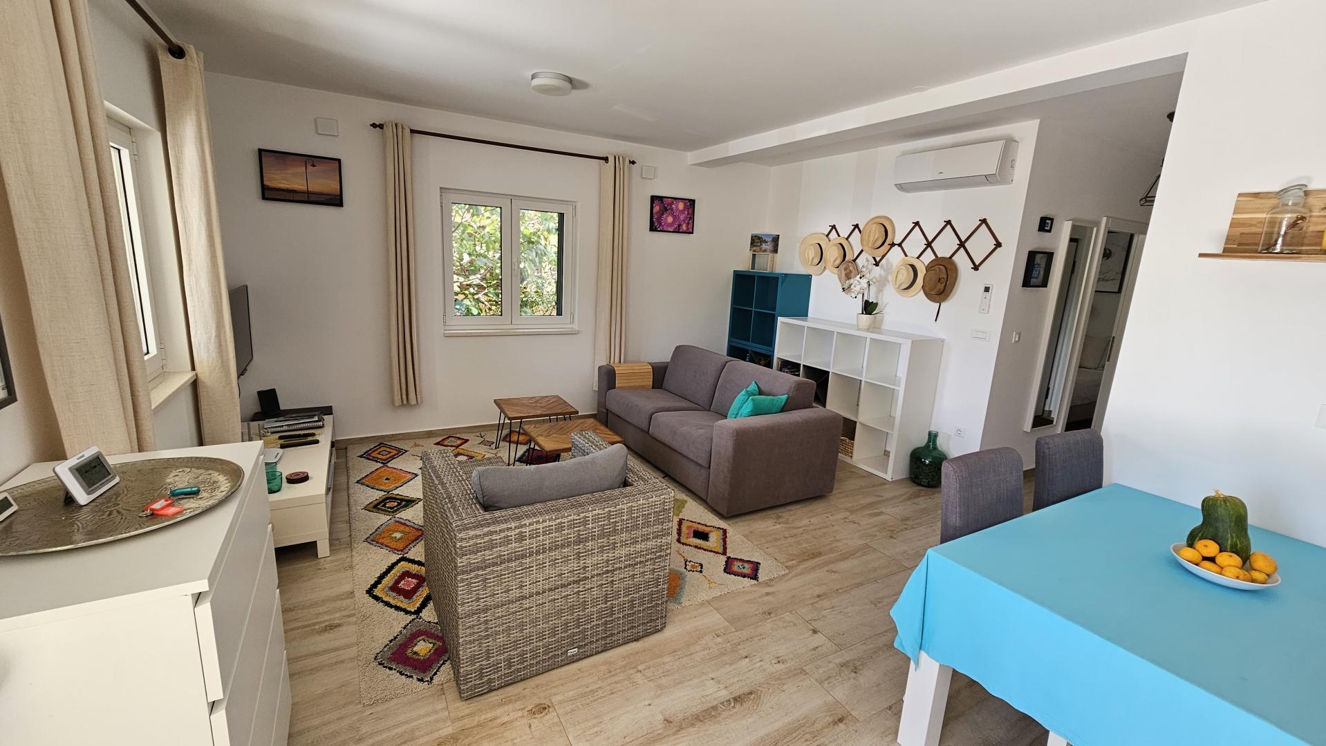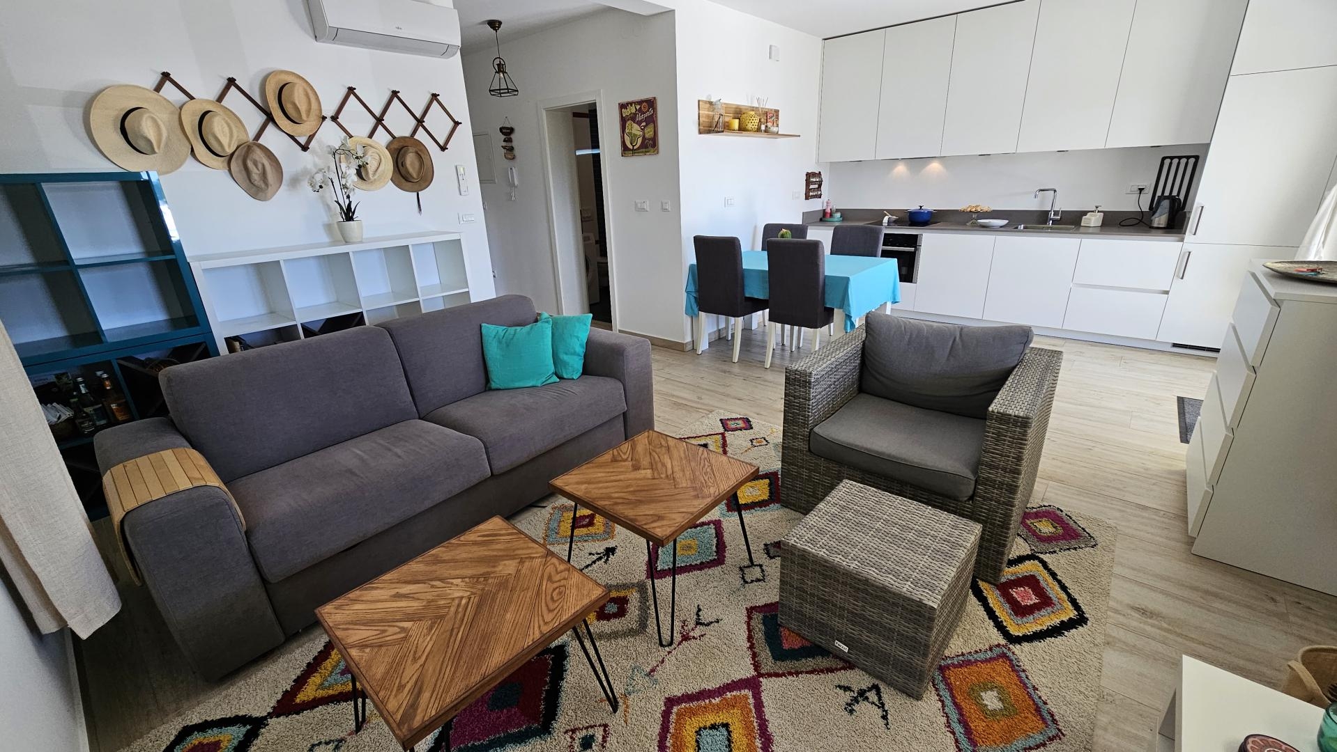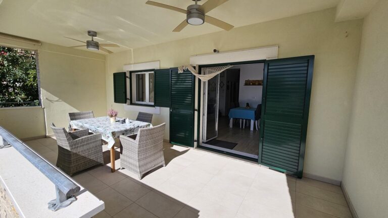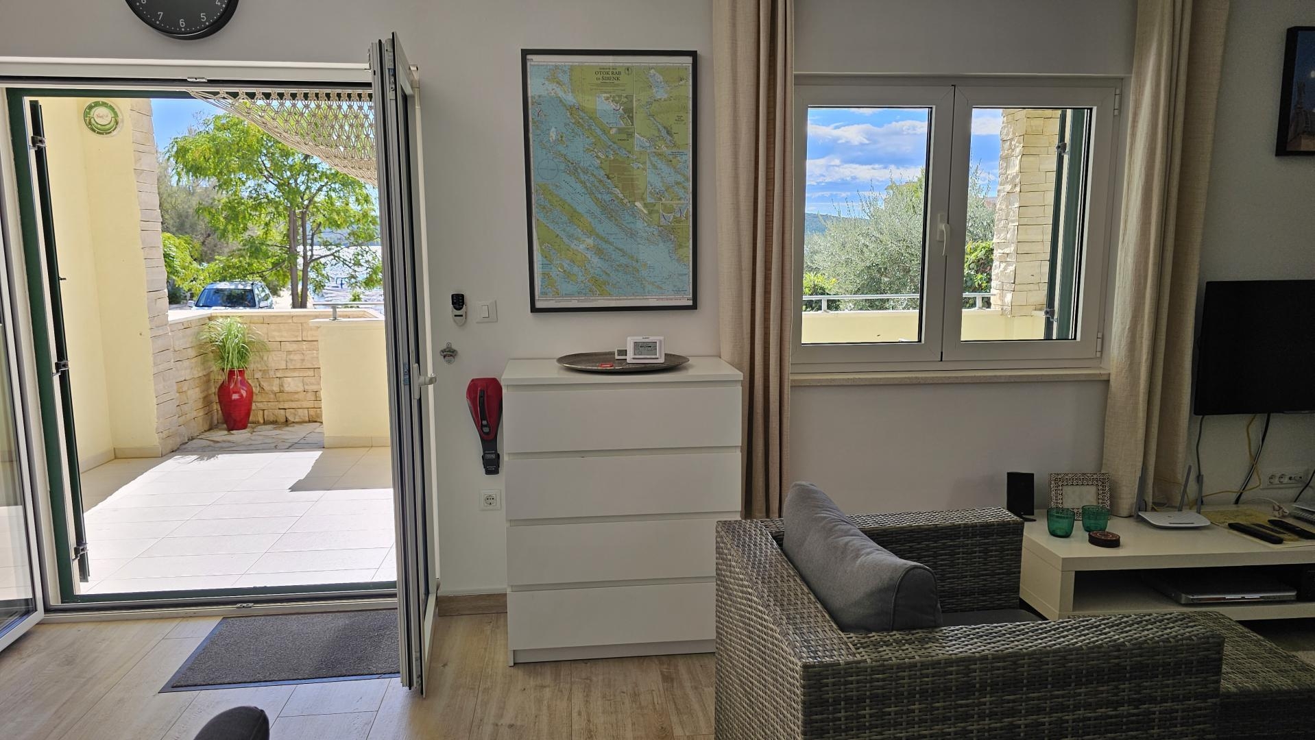 • Terasa/Lodžie: Velká krytá terasa/lodžie s krásným výhledem na moře, přístupná z obývacího pokoje. Ideální pro ranní kávu nebo večerní relaxaci.